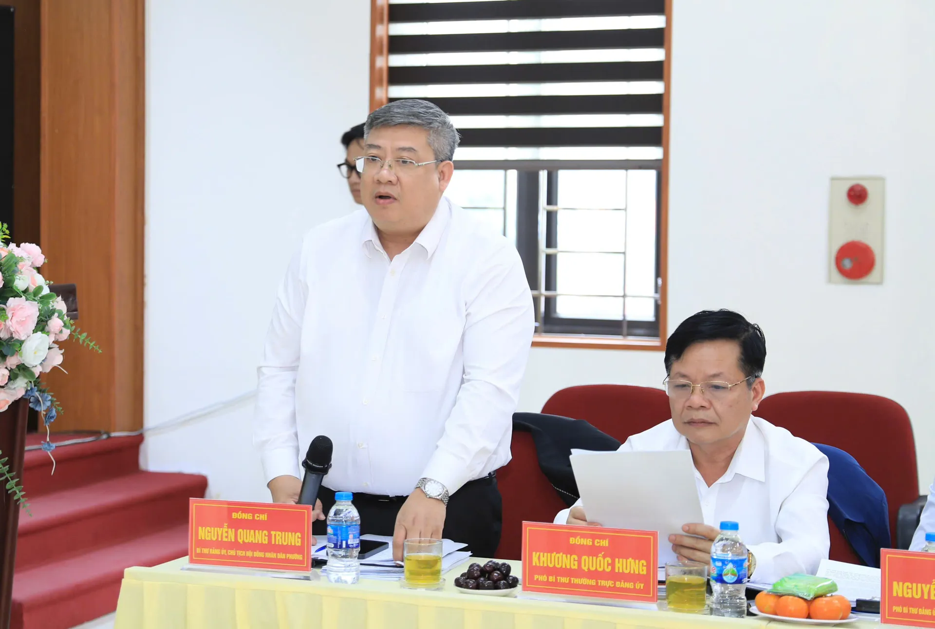 Bí thư Đảng ủy, Chủ tịch HĐND phường Định Công Nguyễn Quang Trung phát biểu tại buổi làm việc. Ảnh: Quang Thái