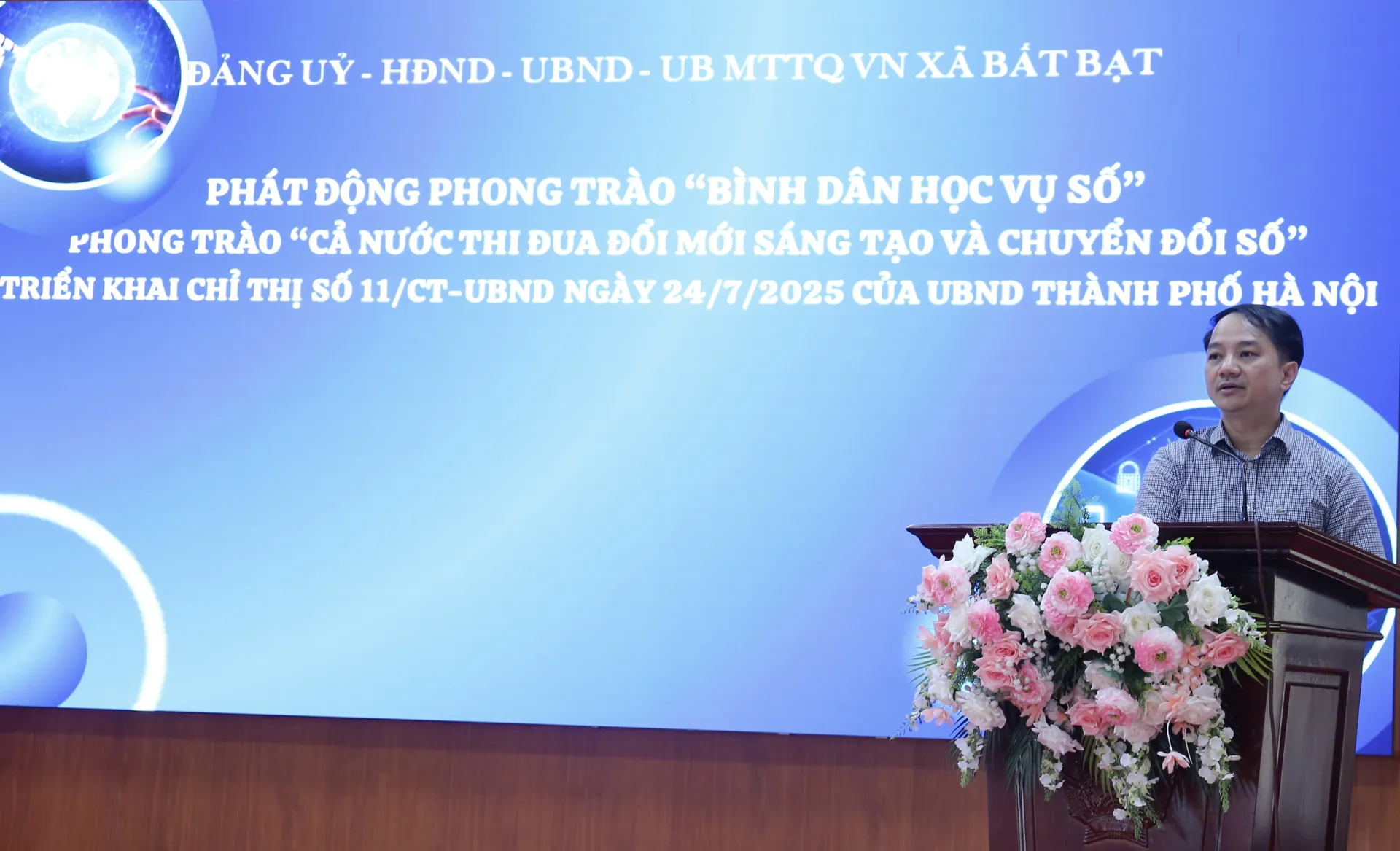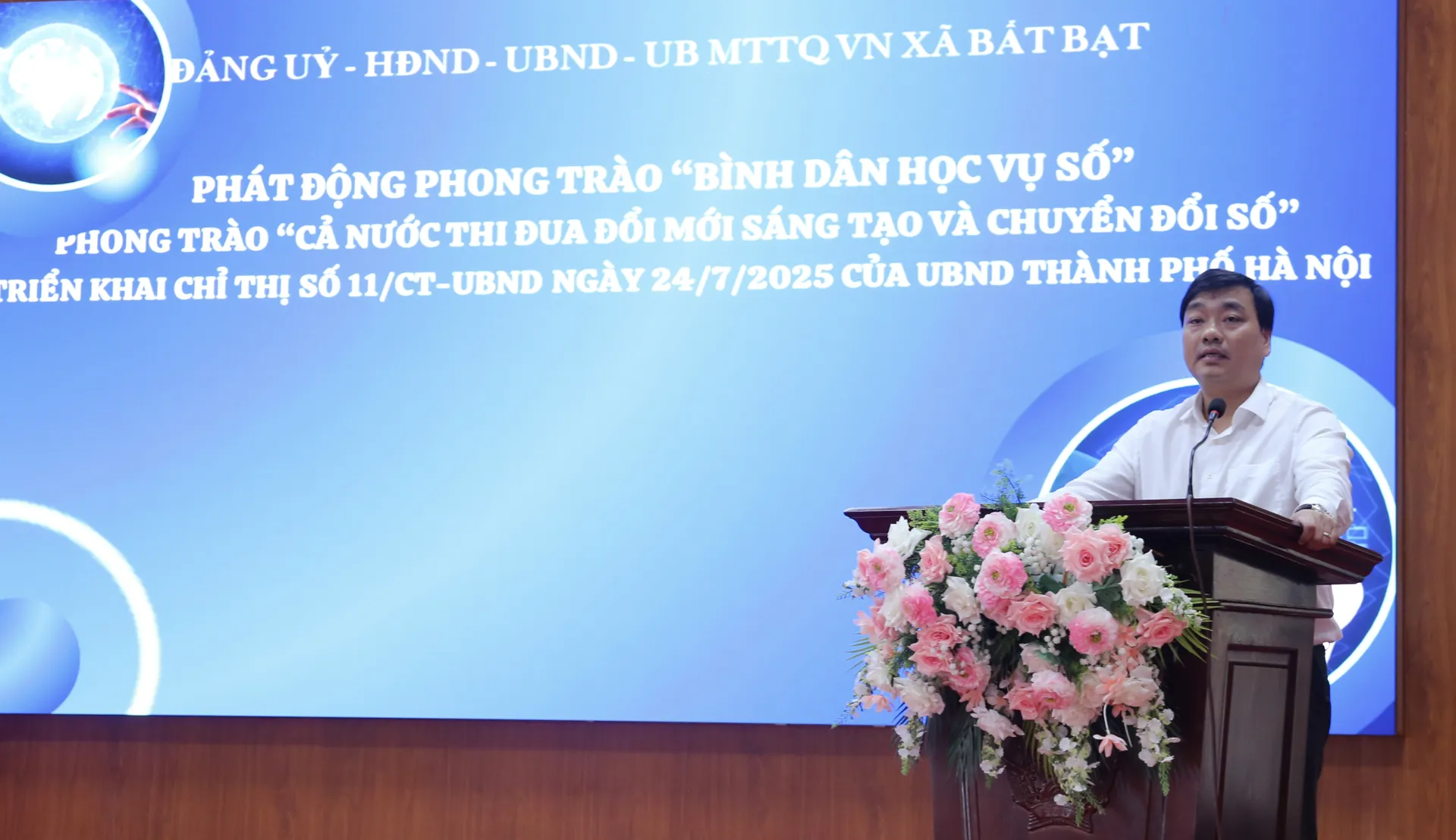Kinhtedothi - Chiều 18/8, UBND xã Bất Bạt tổ chức Chương trình phát động hưởng ứng Phong trào “Bình dân học vụ số”, phong trào “cả nước thi đua đổi mới sáng tạo và chuyển đổi số” và Chỉ thị số 11/CT UBND ngày 24/7/2025 của UBND TP Hà Nội về triển khai chiến dịch “45 ngày đêm ra quân hỗ trợ hoạt động chuyển đổi số tại các xã, phường trong giai đoạn đầu vận hành mô hình chính quyền địa phương hai cấp”.