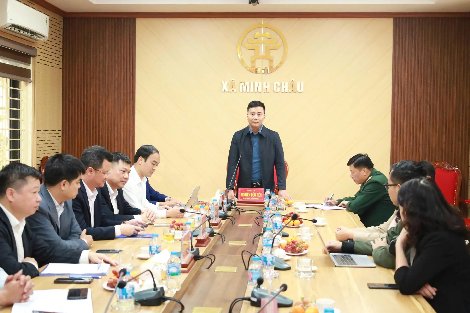 Bí thư Đảng ủy, Chủ tịch HĐND xã Minh Châu Nguyễn Đức Tiến phát biểu tại hội nghị.