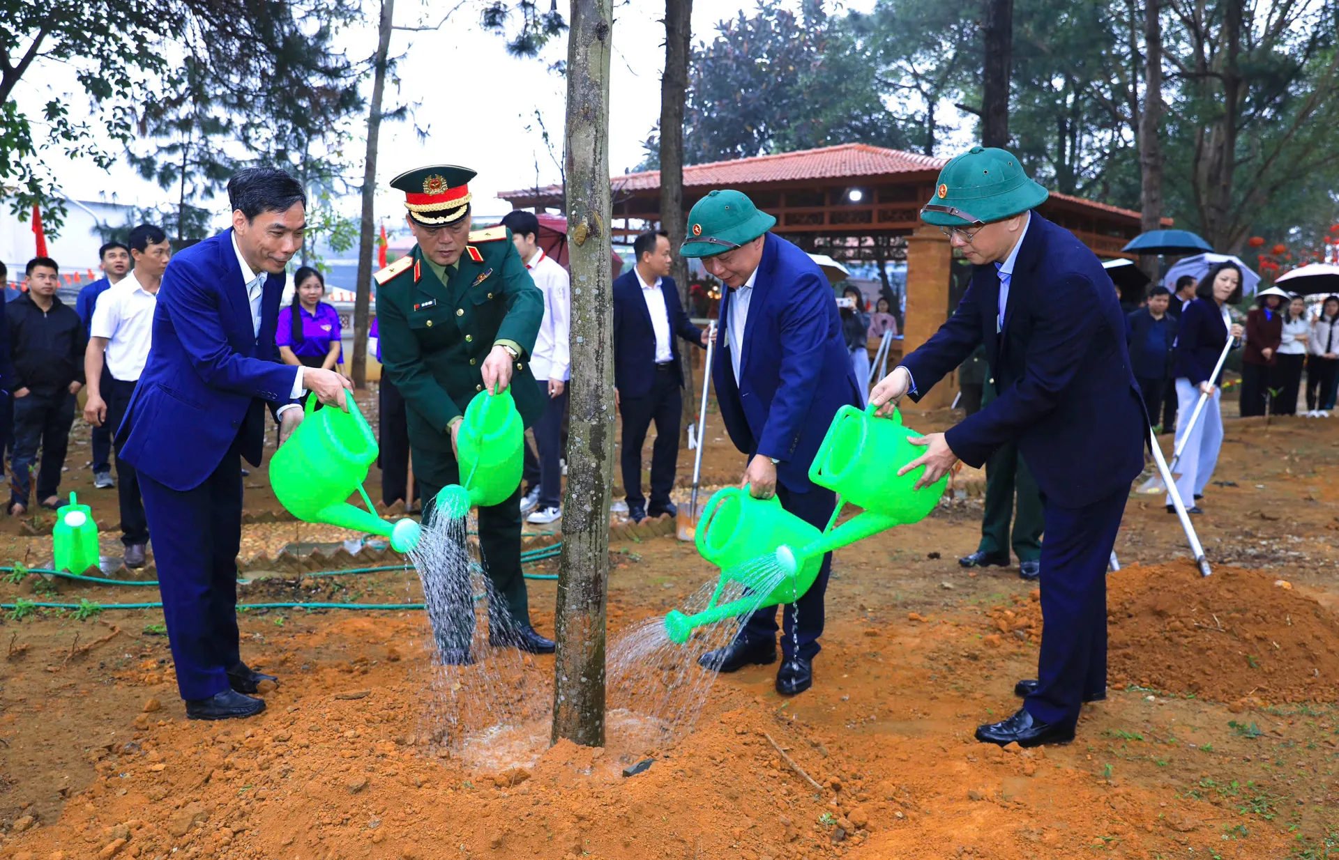 Phó Bí thư Thành ủy Hà Nội Nguyễn Văn Phong cùng các đại biểu trồng cây trong khuôn viên di tích đền Măng Sơn.