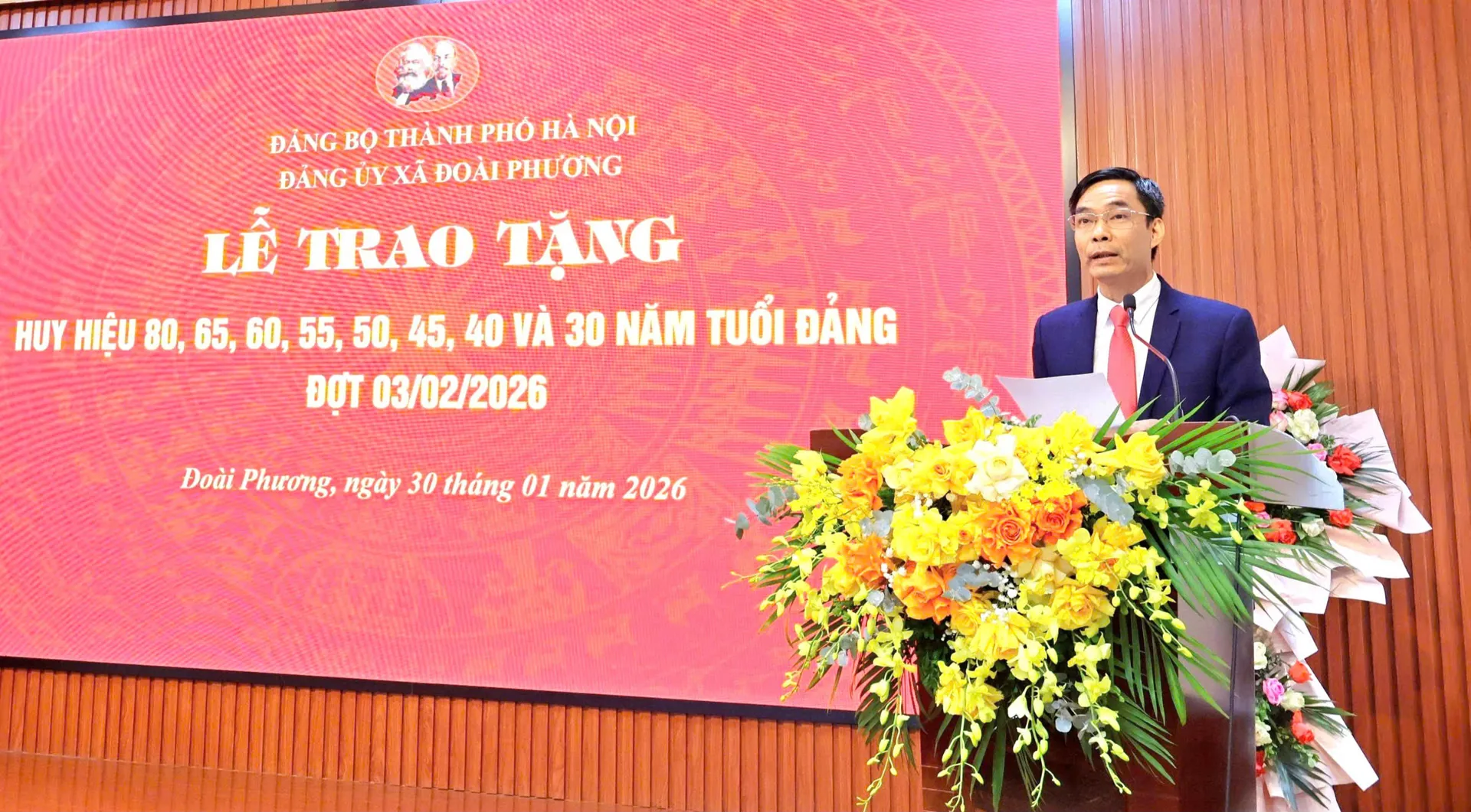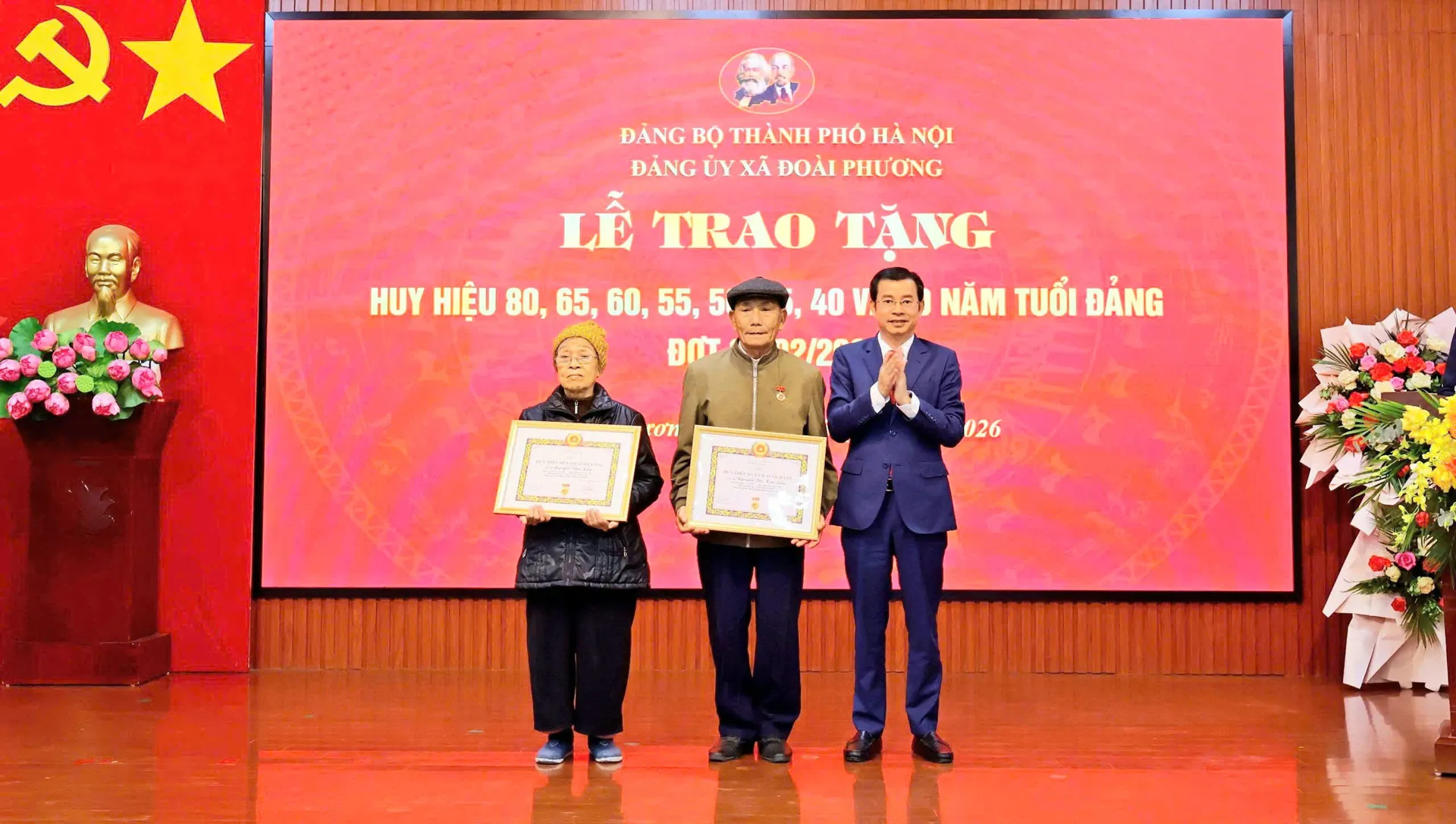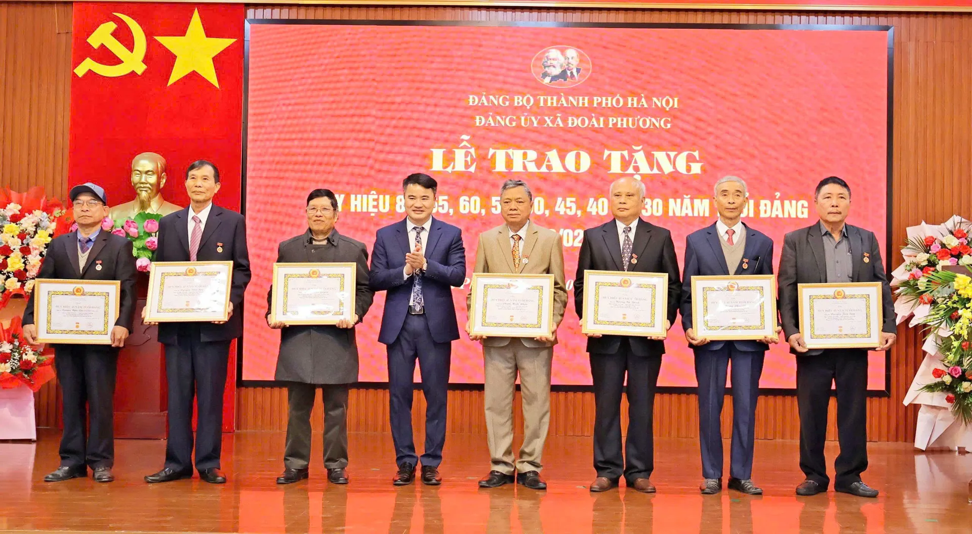 Trong dịp 3/2/2026, toàn xã Đoài Phương có 36 đảng viên được trao tặng Huy hiệu Đảng. Trong đó có 1 đồng chí được trao huy hiệu 80 năm tuổi Đảng, 1 đồng chí được trao huy hiệu 65 năm tuổi Đảng, 4 đồng chí được trao huy hiệu 60 năm tuổi Đảng, 3 đồng chí được trao huy hiệu 55 năm tuổi Đảng, 2 đồng chí được trao huy hiệu 50 năm tuổi Đảng, 7 đồng chí được trao huy hiệu 45 năm tuổi Đảng, 13 đồng chí được trao huy hiệu 40 năm tuổi Đảng, 5 đồng chí được trao huy hiệu 30 năm tuổi Đảng. 02 đồng chí được truy tặng huy hiệu 30 năm và 60 năm tuổi Đảng. Đối với 1 đảng viên được tặng Huy hiệu 80 năm tuổi đảng sẽ được tổ chức trao tặng tại nhà riêng ở thôn Đoàn Kết.