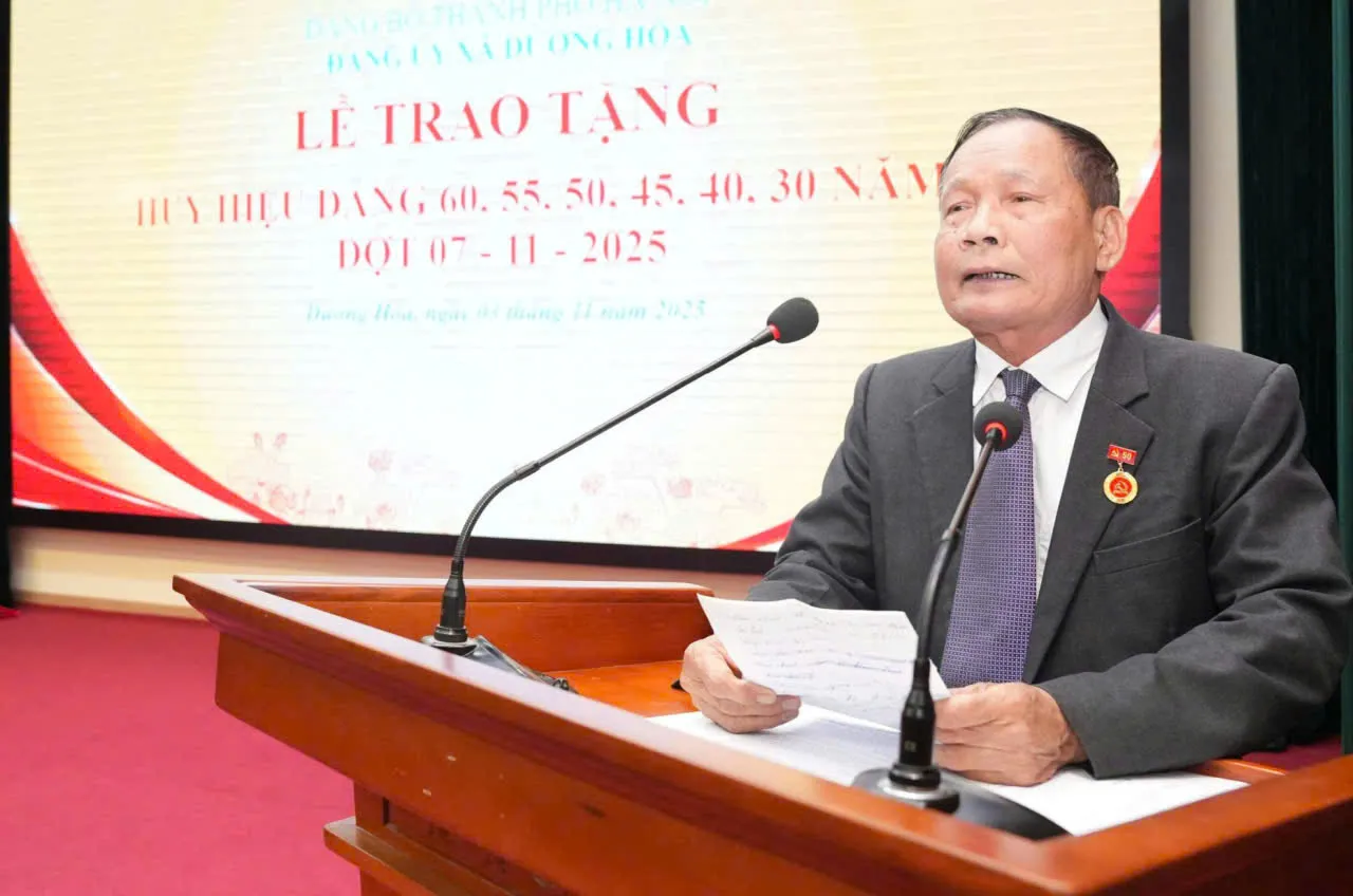 Tại buổi lễ, Thường trực Đảng uỷ xã Dương Hòa đã trực tiếp gắn Huy hiệu Đảng cao quý lên ngực các đảng viên lão thành, đồng thời gửi lời chúc sức khỏe, hạnh phúc và tri ân sâu sắc nhất. Đối với trường hợp ông Nguyễn Danh Vinh (Chi bộ thôn Minh Hiệp 2 được truy tặng Huy hiệu 45 năm tuổi Đảng), đại diện lãnh đạo xã đã trao Huy hiệu Đảng đến thân nhân và bày tỏ lòng kính trọng và biết ơn sâu sắc về những đóng góp thầm lặng nhưng vô cùng lớn lao của ông Nguyễn Danh Vinh đối với sự nghiệp của Đảng.