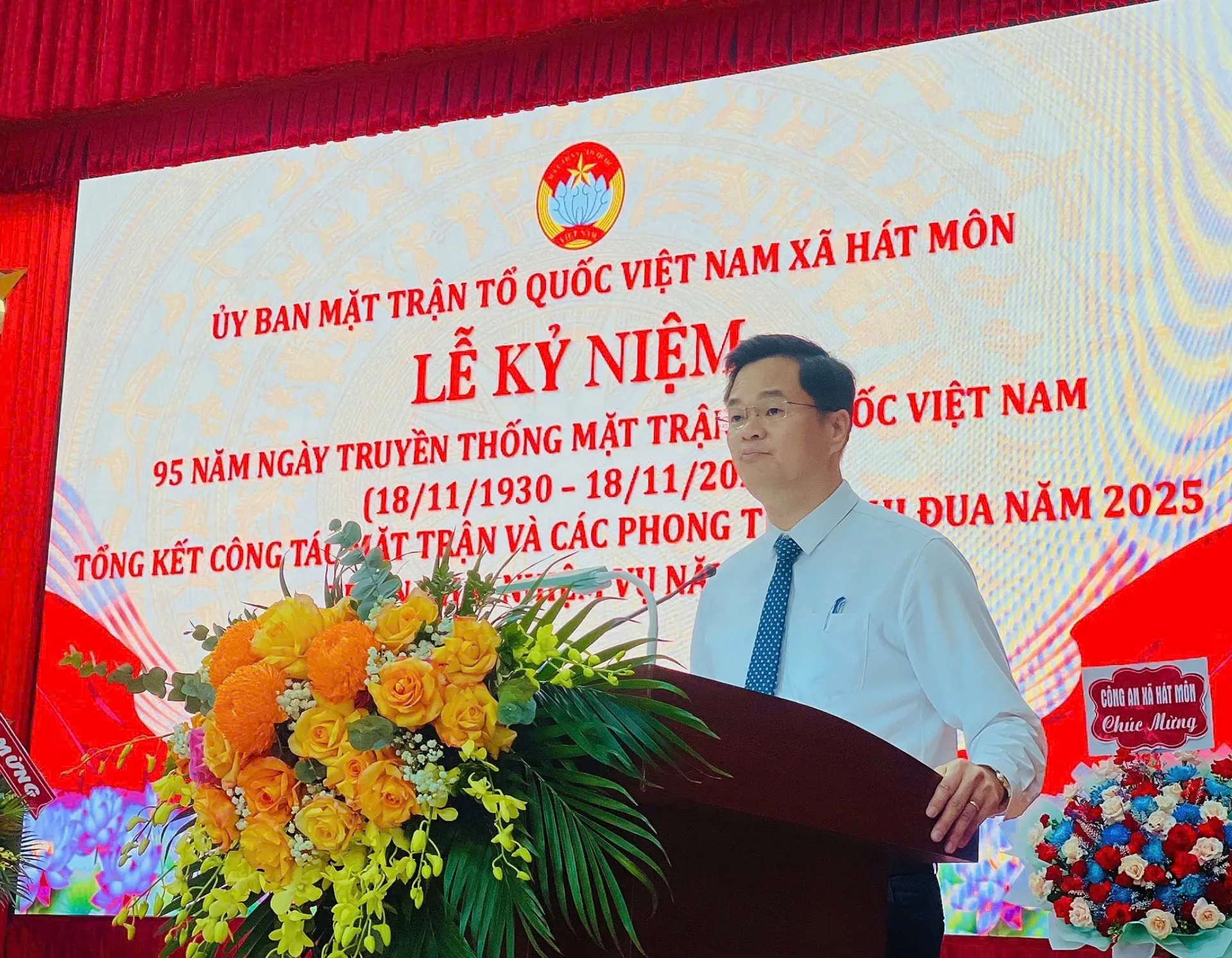 Tại buổi lễ, Chủ tịch Ủy ban MTTQ xã Hát Môn Kiều Thị Kim Dung đã ôn lại truyền thống 95 năm vẻ vang của MTTQ Việt Nam, khẳng định vai trò quan trọng của Mặt trận trong củng cố, phát huy sức mạnh đại đoàn kết toàn dân tộc. Đồng thời nhấn mạnh, tự hào truyền thống 95 năm qua, MTTQ xã Hát Môn luôn kế thừa và phát huy tinh thần đoàn kết, trách nhiệm, gắn bó mật thiết với Nhân dân; chủ động, sáng tạo trong thực hiện nhiệm vụ, góp phần tích cực vào sự phát triển toàn diện của địa phương.