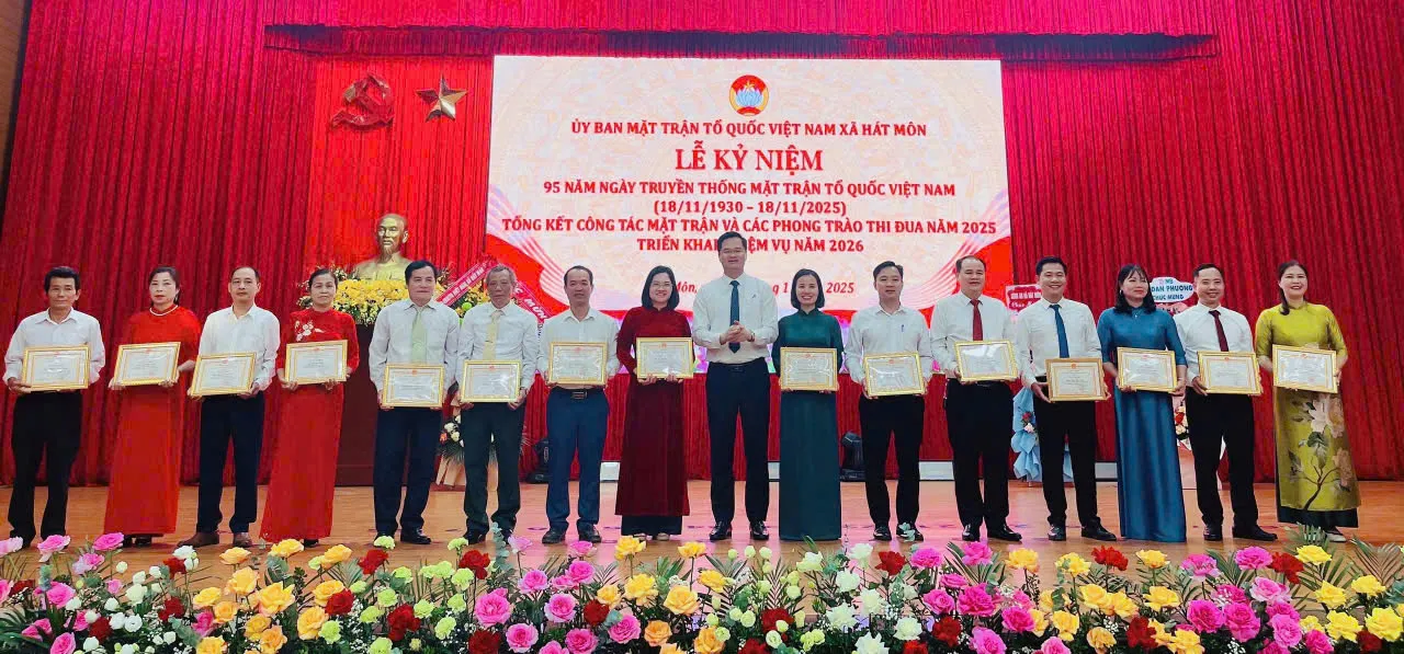 Kinhtedothi - Ngày 14/11, Ủy ban MTTQ xã Hát Môn long trọng tổ chức Chương trình Kỷ niệm 95 năm Ngày Truyền thống MTTQ Việt Nam (18/11/1930 - 18/11/2025). Đây là dịp có ý nghĩa đặc biệt nhằm tôn vinh truyền thống đoàn kết, gắn bó của khối đại đoàn kết toàn dân tộc; đồng thời nhìn lại chặng đường hình thành, phát triển và những đóng góp quan trọng của Mặt trận trong sự nghiệp xây dựng và bảo vệ Tổ quốc.