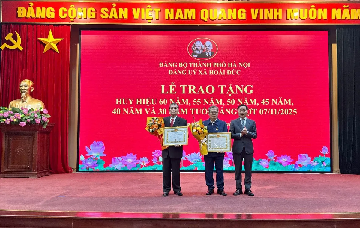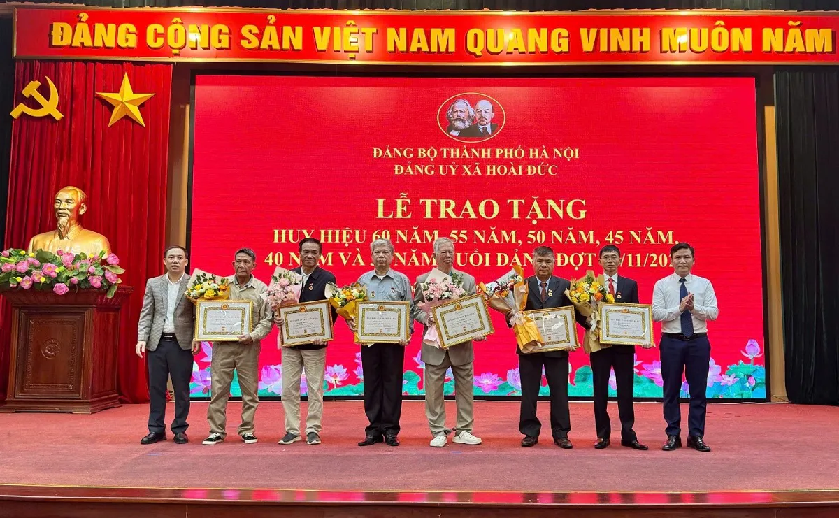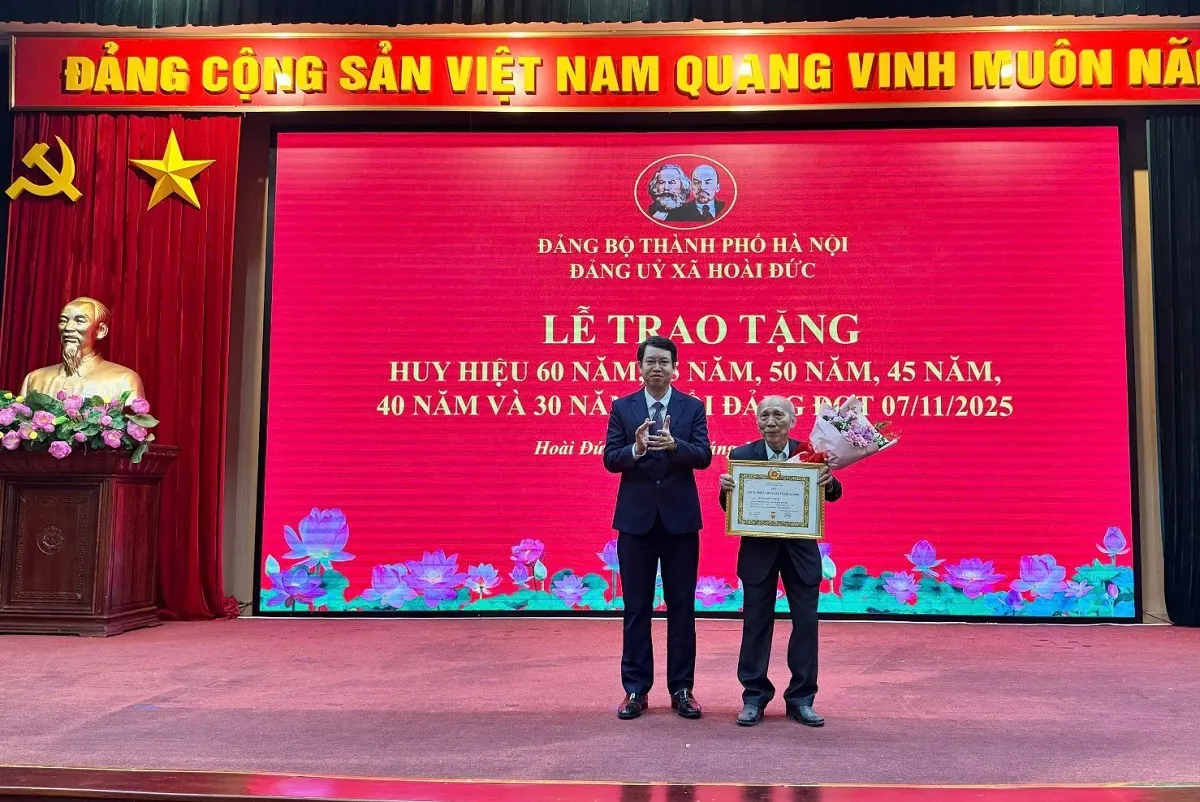 Kinhtedothi - Sáng 3/11, Đảng uỷ xã Hoài Đức long trọng tổ chức lễ trao Huy hiệu Đảng (đợt 7/11/2025) cho 33 đảng viên từ 60, 55, 50, 45, 40 và 30 năm tuổi Đảng.