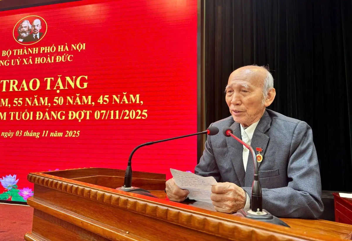 Thay mặt Ban Thường vụ, Bí thư Đảng ủy xã Hoài Đức Nguyễn Hoàng Trường chúc mừng và tri ân các đảng viên vinh dự được nhận Huy hiệu Đảng. Theo Bí thư Đảng ủy xã Hoài Đức, việc trao tặng Huy hiệu Đảng là phần thưởng cao quý, thể hiện sự trân trọng và ghi nhận của Đảng đối với những cống hiến to lớn của các thế hệ đảng viên, những người luôn kiên trung với Đảng, tận tụy với dân, trọn đời vì Tổ quốc. Mỗi tấm Huy hiệu không chỉ là biểu tượng của danh dự và niềm tự hào, mà còn là minh chứng cho lòng trung thành tuyệt đối, ý chí kiên định và tinh thần phụng sự không ngừng nghỉ của người đảng viên.
