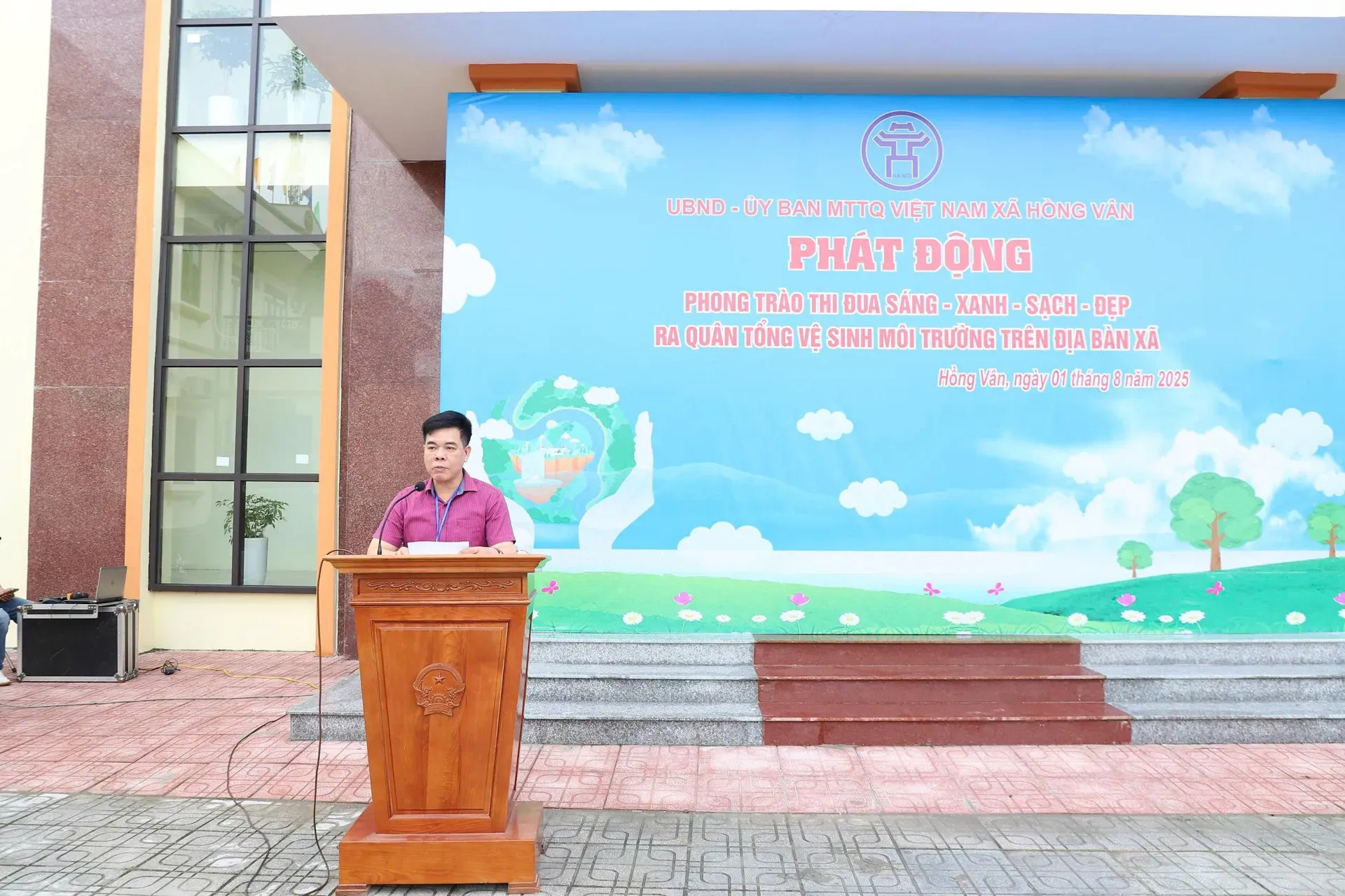 Phó Bí thư Đảng ủy, Chủ tịch UBND xã Hồng Vân Lê Tuấn Dũng phát biểu tại lễ ra quân bảo vệ môi trường