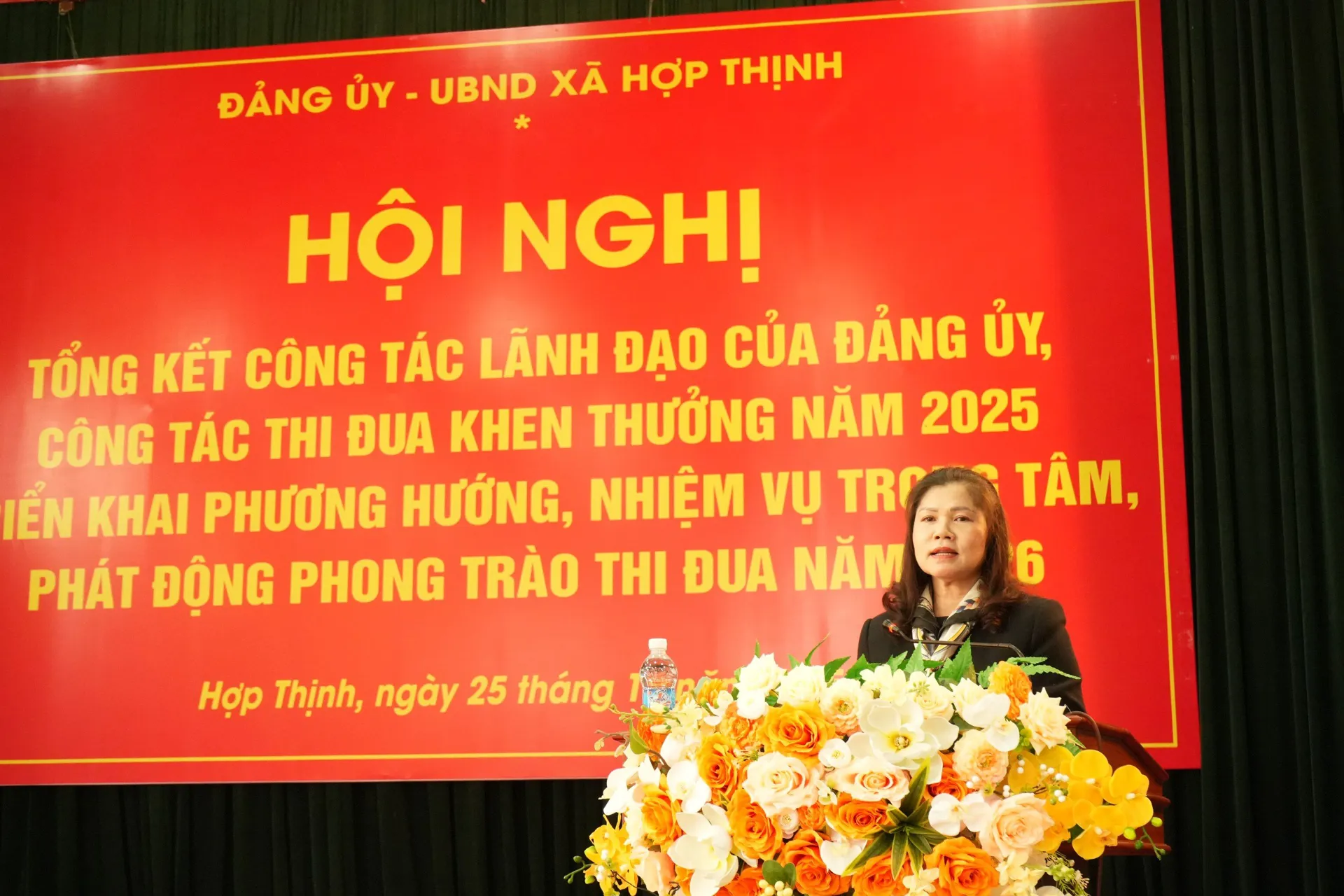 Phát biểu chỉ đạo hội nghị, bà Lâm Thị Hương Thành, Phó Chủ tịch HĐND tỉnh Bắc Ninh ghi nhận và biểu dương những thành tích tốt đẹp mà Đảng bộ, chính quyền và Nhân dân xã Hợp Thịnh đã đạt được trong năm qua, nhất là sau 6 tháng thực hiện mô hình chính quyền địa phương 2 cấp. Phát huy kết quả đạt được, năm 2026 và những năm tiếp theo bà Lâm Thị Hương Thành nhấn mạnh xã Hợp Thịnh tiếp tục bám sát chỉ tiêu Nghị quyết Đại hội Đảng bộ xã lần thứ I đã đề ra để chỉ đạo thực hiện. Quan tâm tổ chức bộ máy và cán bộ, rà soát cán bộ xã, thôn để kiện toàn bộ máy đi vào hoạt động đầy đủ, hiệu quả; thử thách đánh giá, bổ nhiệm cán bộ để đảm bảo nhiệm vụ được giao; xây dựng lực lượng cán bộ vừa hồng vừa chuyên đáp ứng yêu cầu tình hình mới.