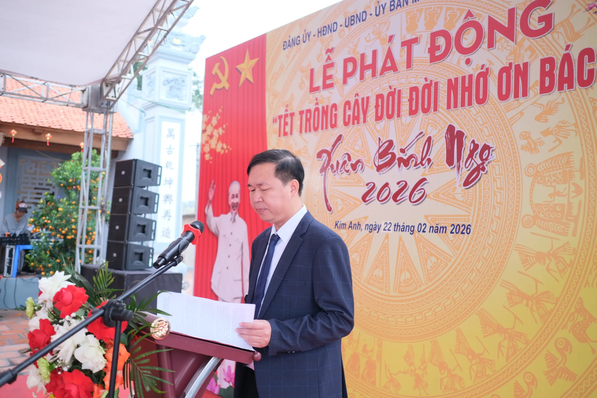 Phó Chủ tịch UBND xã Kim Anh Nguyễn Văn Toàn phát biểu và chỉ đạo tại Lễ phát động "Tết trồng cây đời đời nhớ ơn Bác Hồ" Xuân Bính Ngọ 2026. Ảnh: Sỹ Hào
