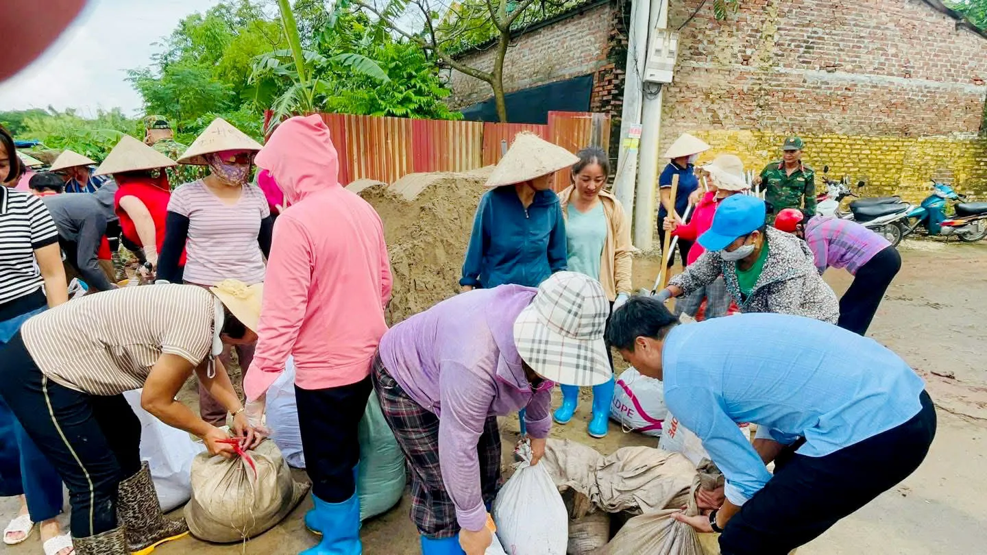 Công an xã Liên Minh cùng các lực lượng tham gia gia cố đập bao Phương Tiến, thuộc thôn 11, khu vực Trung Châu.