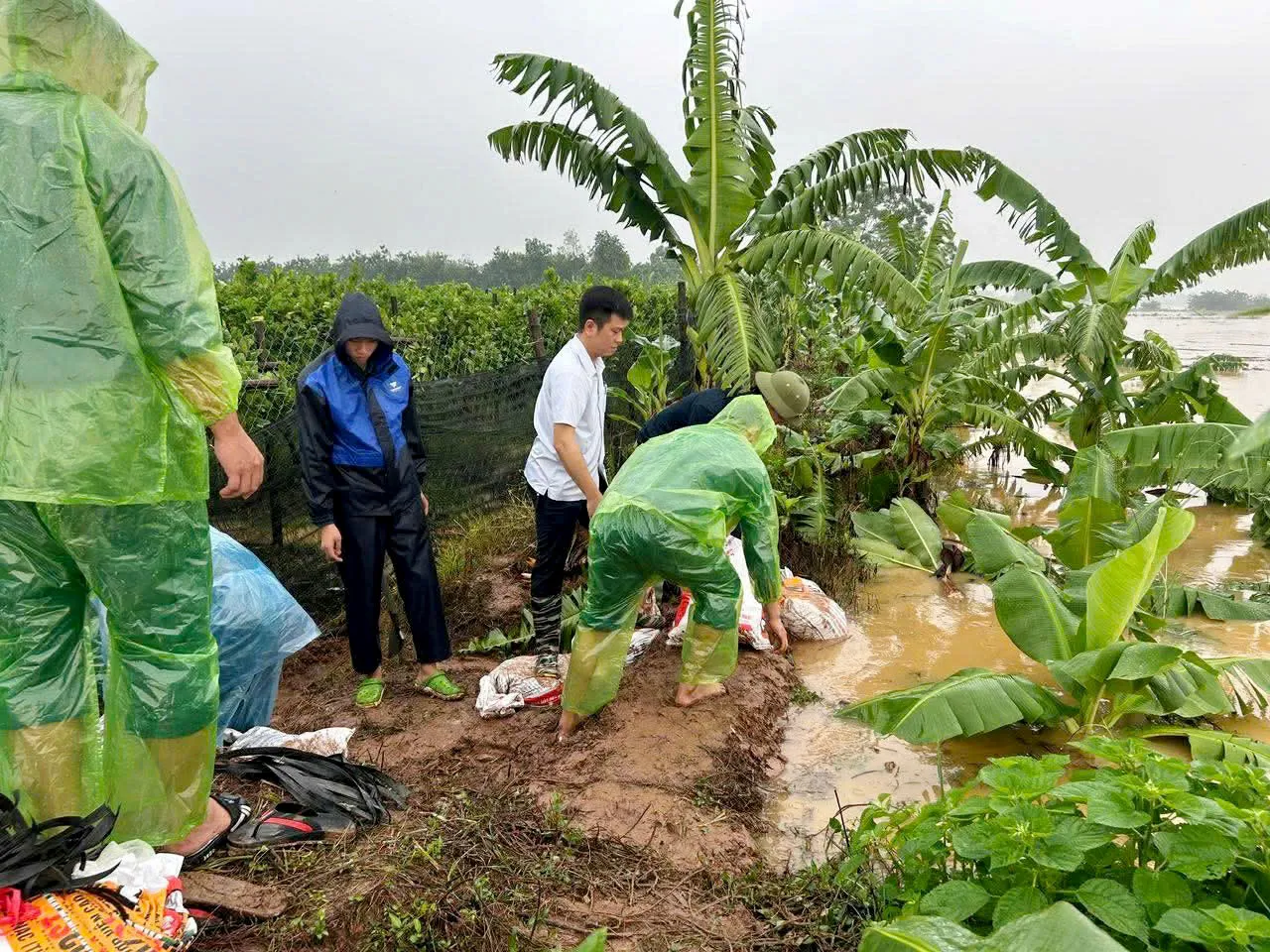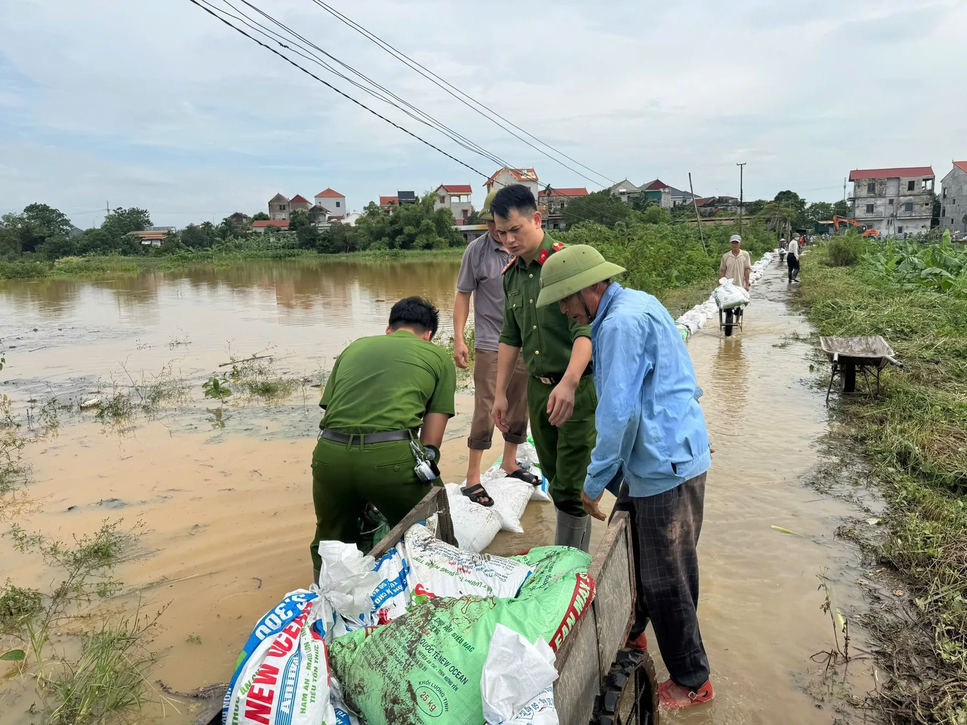 Công an xã Liên Minh cùng người dân đắp những bao cát ngăn nước tràn vào khu dân cư, đồng ruộng.