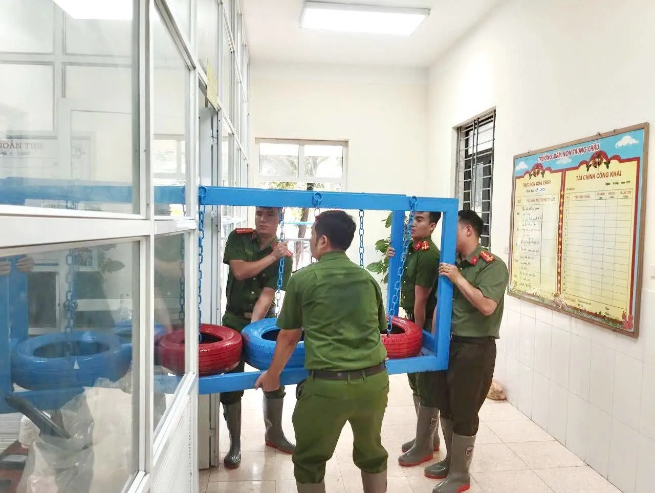 Đặc biệt, tại Trường Mầm non Trung Châu, lực lượng Công an xã đã phối hợp cùng giáo viên, phụ huynh nhanh chóng vận chuyển bàn ghế, đồ dùng học tập, dụng cụ sinh hoạt, bảo đảm không để nước lũ làm hư hỏng, ảnh hưởng đến hoạt động dạy và học sau mưa lũ.