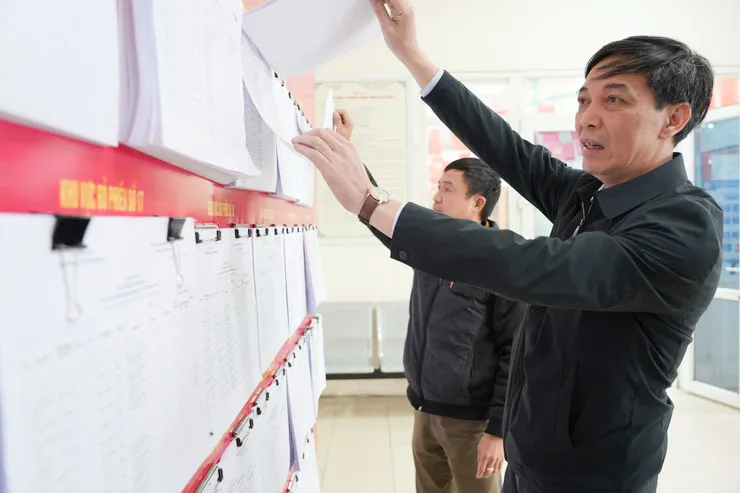 Chủ tịch UBND xã Nguyễn Quý Mạnh kiểm tra việc niêm yết danh sách cử tri.