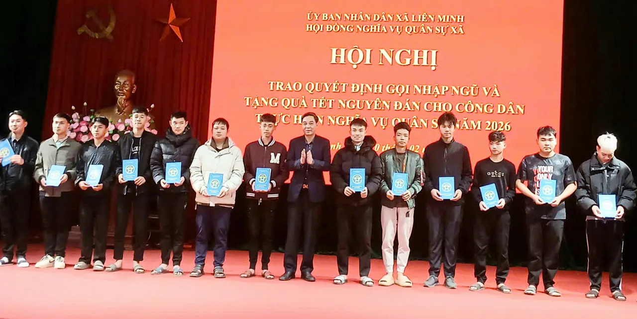Kinhtedothi - Chiều 10/2, UBND xã Liên Minh tổ chức hội nghị giao quyết định gọi nhập ngũ năm 2026 và tặng quà Tết Nguyên đán Bính Ngọ cho công dân thực hiện nghĩa vụ quân sự năm 2026.