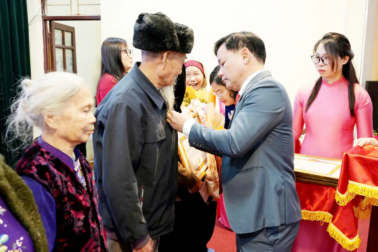 Bí thư Đảng ủy, Chủ tịch HĐND xã Liên Minh Nguyễn Tiến Toàn và Phó Bí thư Thường trực Đảng ủy xã Nguyễn Thị Hường trao Huy hiệu Đảng tặng các đảng viên lão thành.
