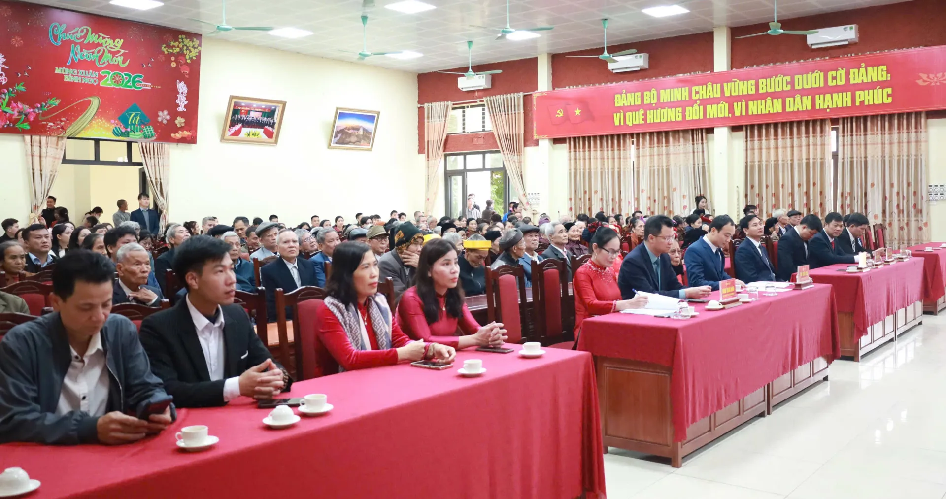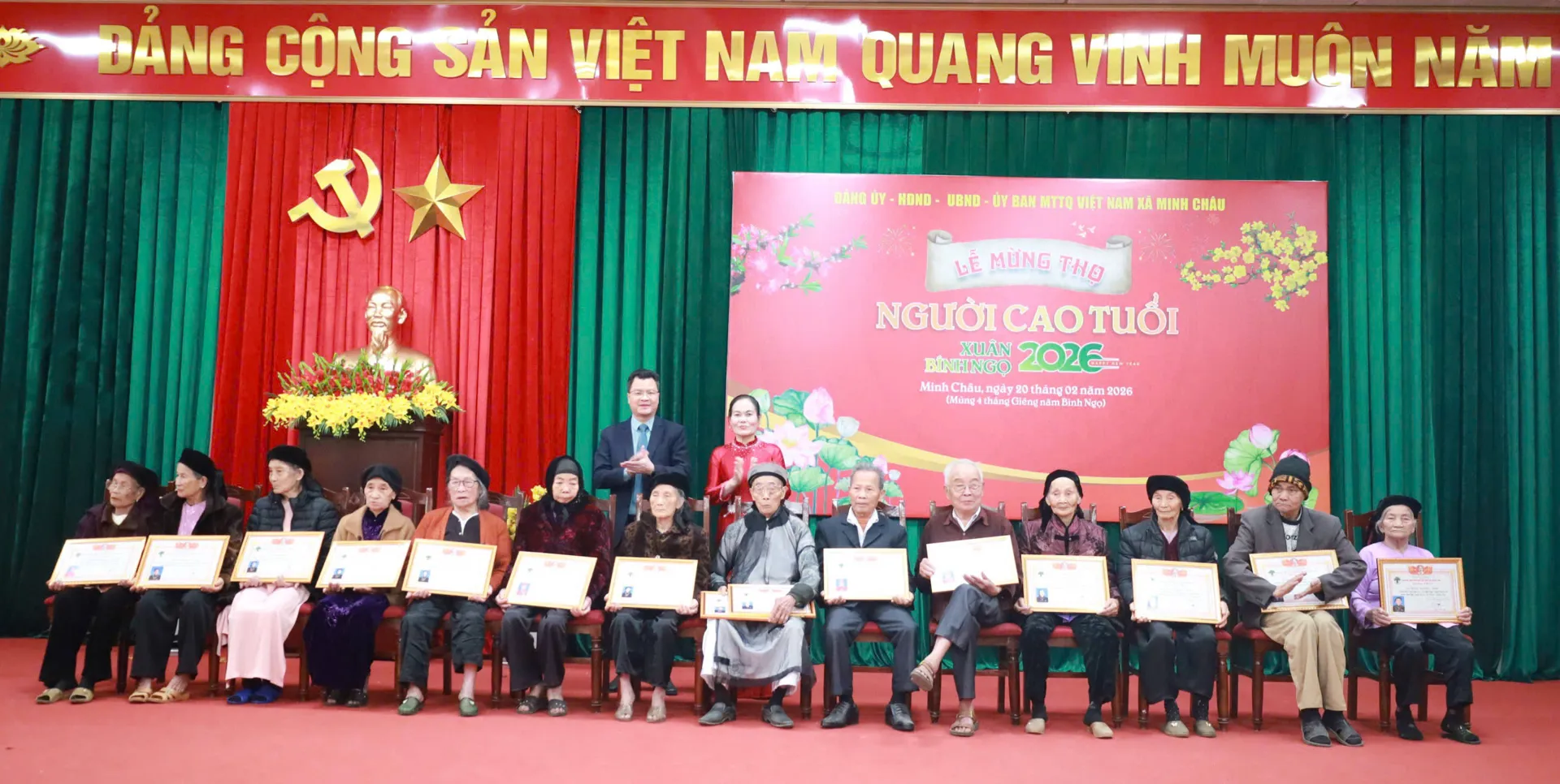 Trong dịp Xuân Bính Ngọ năm 2026, xã Minh Châu có 116 cụ tuổi tròn được mừng thọ. Trong không khí trang trọng, ấm áp nghĩa tình, lãnh đạo xã Minh Châu đã trực tiếp trao giấy chứng nhận và gửi lời chúc mừng tốt đẹp tới các cụ tròn 100, 95, 90, 85, 80, 75 và 70 tuổi, thể hiện sự trân trọng và lòng biết ơn của Đảng bộ, chính quyền, Nhân dân địa phương đối với những cống hiến của các thế hệ đi trước.