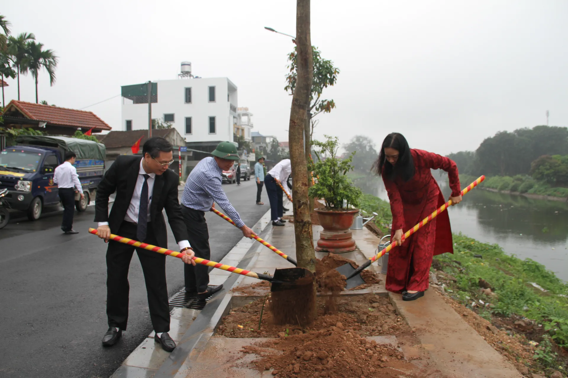 Các đồng chí lãnh đạo xã Mỹ Đức trồng cây xanh. Ảnh: VB