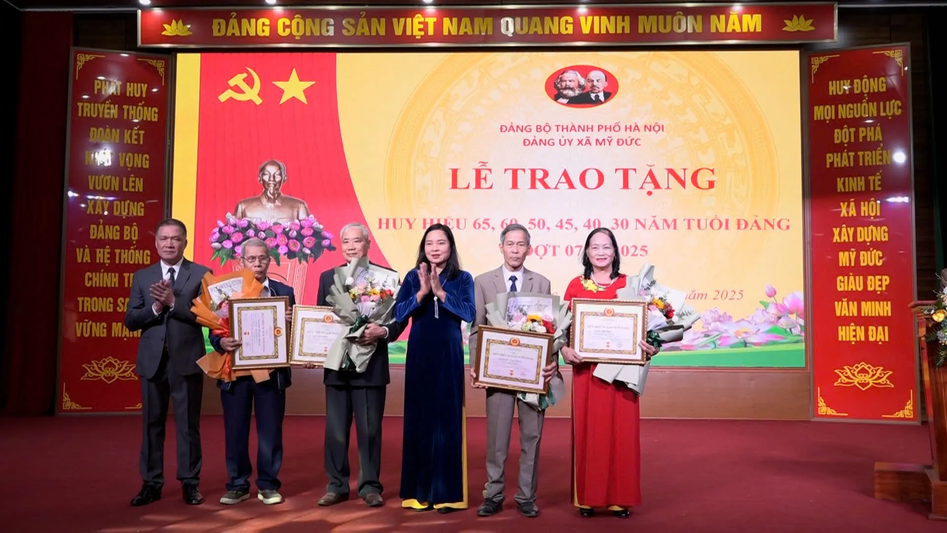 Tại buổi lễ, Đảng ủy xã Mỹ Đức đã trao Huy hiệu Đảng đợt 7-2025 cho 25 đảng viên thuộc các mốc 65, 60, 55, 50, 45, 40 và 30 năm tuổi Đảng. Trong đó, 65 năm tuổi Đảng có 1 đồng chí, 60 năm tuổi Đảng có 2 đồng chí, 50 năm tuổi Đảng có 2 đồng chí, 45 năm tuổi Đảng có 3 đồng chí, 40 năm tuổi Đảng có 8 đồng chí, 30 năm tuổi Đảng 9 đồng chí.