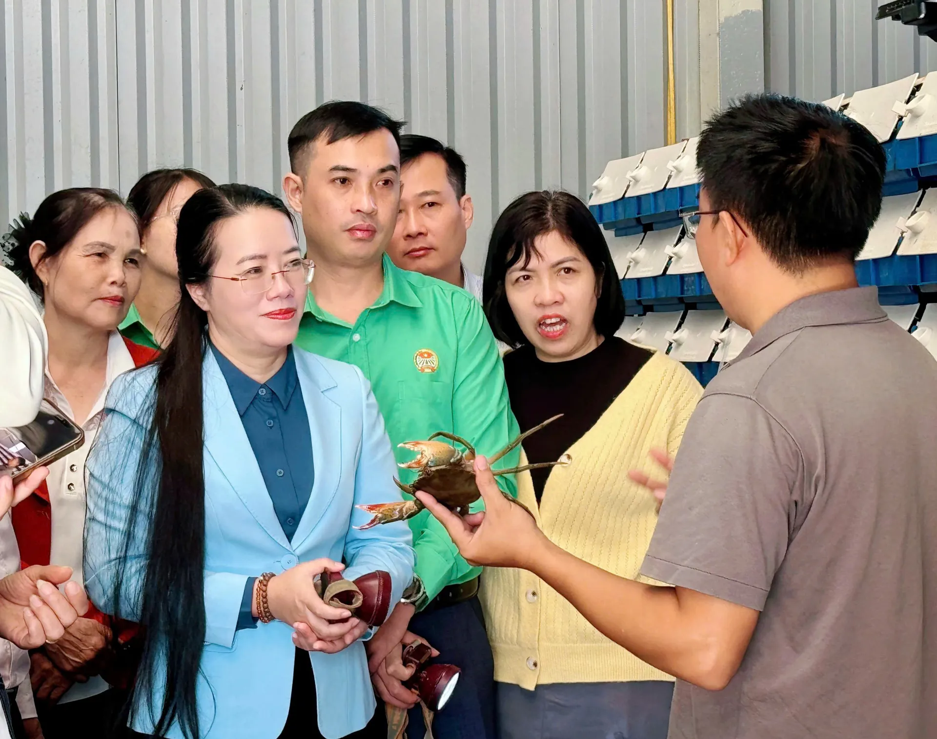 Phó Chủ tịch Ủy ban MTTQ Việt Nam TP Hà Nội, Chủ tịch HND TP Phạm Hải Hoa cùng các đại biểu thăm quan mô hình nuôi cua biển trong nhà của hộ gia đình hội viên Nguyễn Thị Kim Oanh, thôn 3 Vạn Phúc, xã Nam Phù.