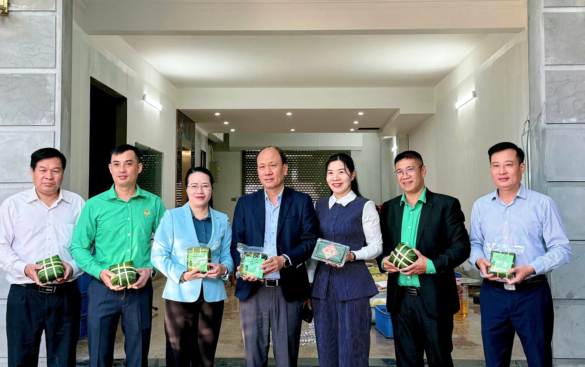 Lãnh đạo Hội Nông dân TP Hà Nội và lãnh đạo xã Nam Phù cùng các đại biểu tham quan cơ sở sản xuất bánh chưng Thành Trung, thôn Tranh Khúc.