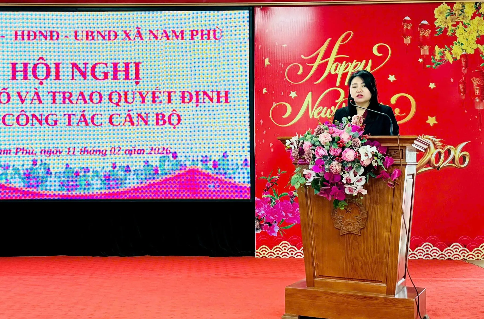 Trưởng Phòng Văn hoá – Xã hội xã Nam Phù Hoàng Thanh Tâm công bố các quyết định về công tác cán bộ.