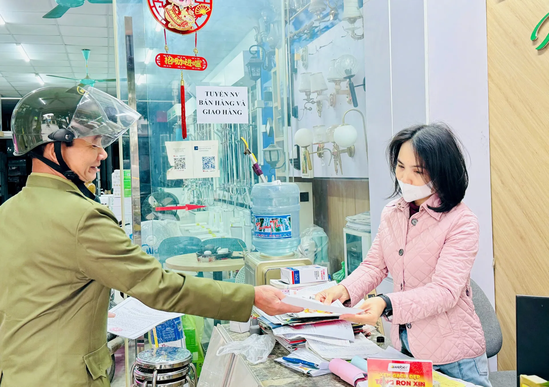 Lực lượng chức năng phát tờ gấp tuyên truyền đến tận cơ sở kinh doanh.