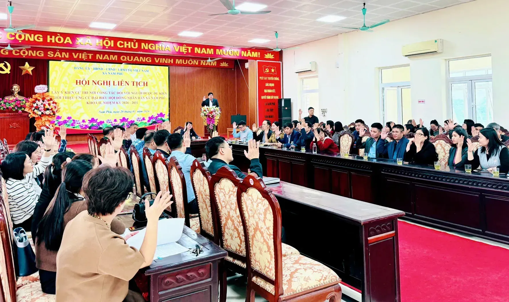 Với tinh thần trách nhiệm cao, hội nghị đã tiến hành biểu quyết tín nhiệm bằng hình thức giơ tay. Kết quả, 100% cử tri tham dự đã nhất trí và bày tỏ sự tín nhiệm cao đối với 19 đồng chí được giới thiệu ứng cử đại biểu HĐND xã Nam Phù nhiệm kỳ 2026-2031.