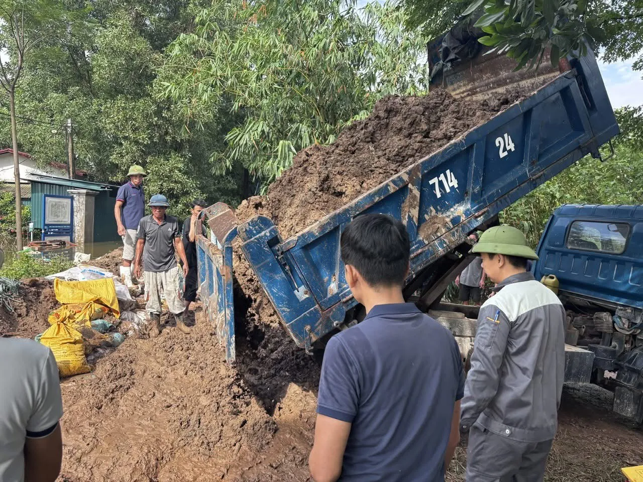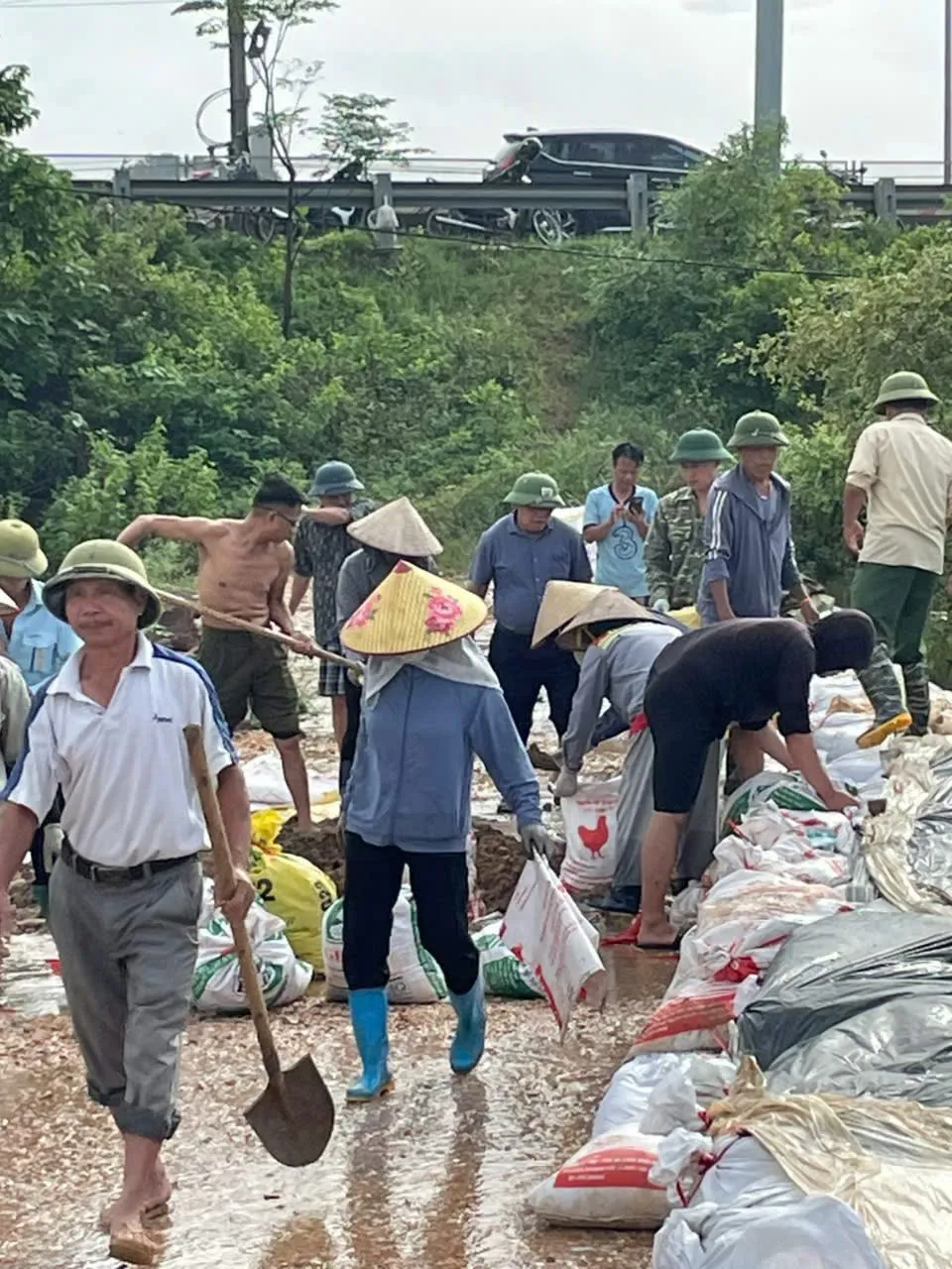 Từng xe chở đất cát được vận chuyển đến, được người dân, các lực lượng dân quân và cán bộ xã Nội Bài tích cực đưa vào bao tải, gia cố dọc tuyến bờ bao, đê tả sông Cà Lồ.