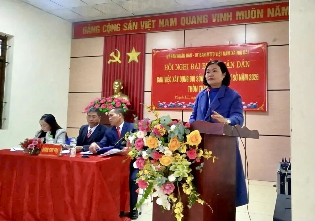Phát biểu tại hội nghị, Chủ tịch Ủy ban MTTQ xã Nội Bài Trương Ngọc Lan nhấn mạnh, hội nghị được lựa chọn tổ chức điểm nhằm đánh giá kết quả thực hiện Nghị quyết Hội nghị đại biểu Nhân dân năm 2025, đồng thời rút kinh nghiệm để triển khai đồng bộ trên toàn địa bàn xã Nội Bài.