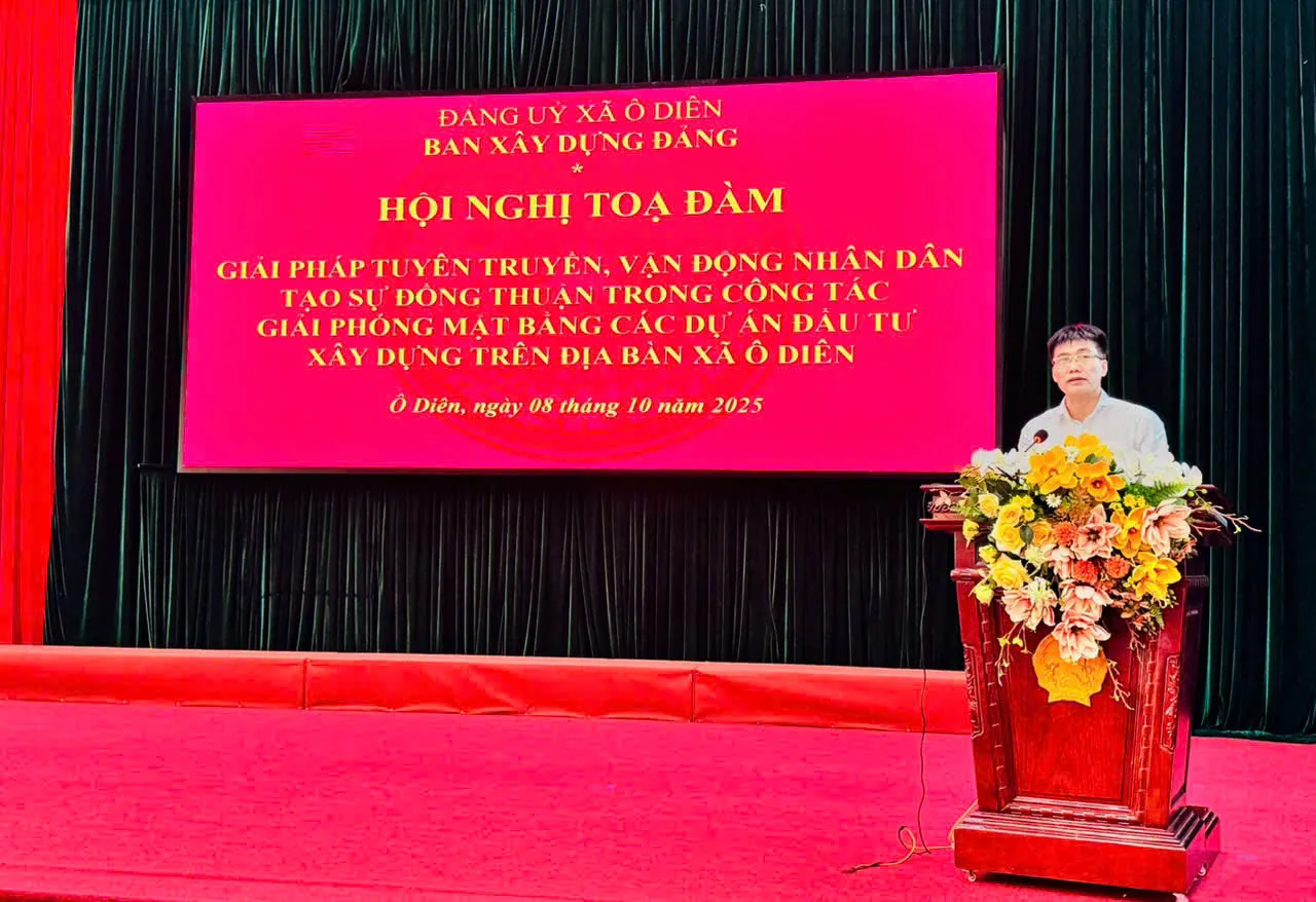 Phát biểu tại tọa đàm, Phó Bí thư Thường trực Đảng ủy xã Ô Diên Phạm Hồng Hoàn nhấn mạnh, công tác giải phóng mặt bằng là khâu quan trọng trong quá trình triển khai thực hiện các dự án phát triển kinh tế - xã hội, cơ sở hạ tầng trên địa bàn xã; có ý nghĩa quan trọng trong việc đẩy mạnh thu hút đầu tư, tạo môi trường thông thoáng cho đầu tư phát triển.