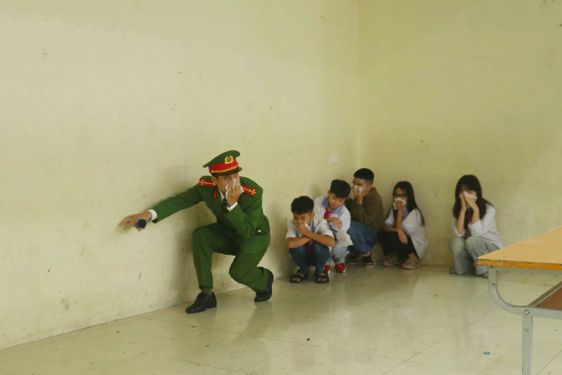 Học sinh được hướng dẫn kỹ năng thoát nạn khi có đám cháy.