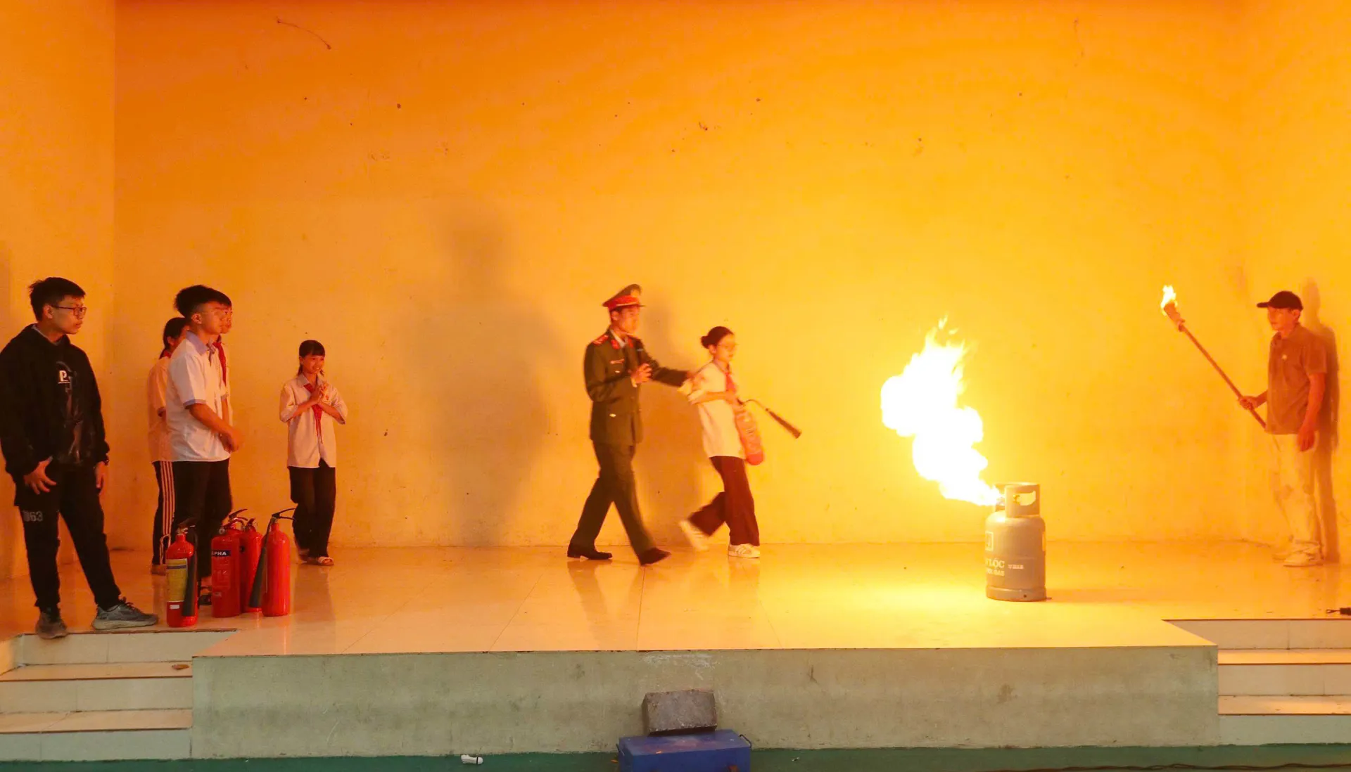 Học sinh được hướng dẫn thực hành kỹ năng chữa cháy bằng bình cứu hỏa.