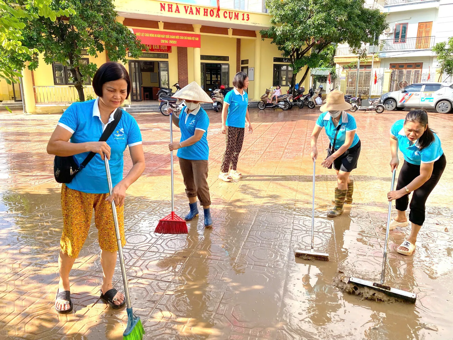 Hội viên phụ nữ xã Ô Diên vệ sinh môi trường Nhà văn hóa cụm 3 Tân Lập.