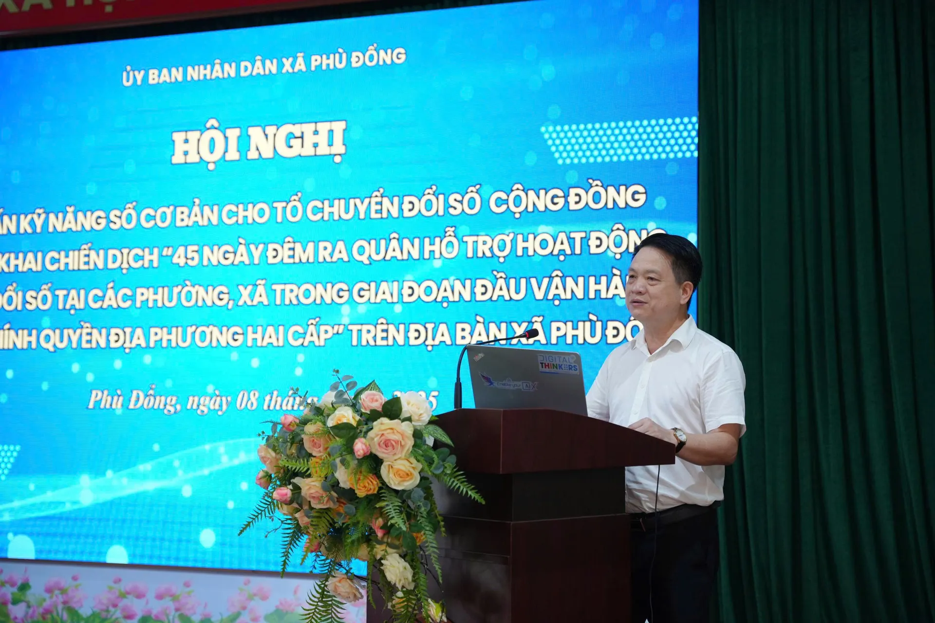 Tại hội nghị, UBND xã Phù Đổng tổ chức tập huấn các kỹ năng số cơ bản nhằm nâng cao năng lực cho Tổ chuyển đổi số cộng đồng của 56 thôn, tổ dân phố trên địa bàn; tổng quan về chuyển đổi số; vai trò của Tổ chuyển đổi số cộng đồng; nhiệm vụ của Tổ chuyển đổi số cộng đồng; cài đặt chữ ký số cá nhân và thao tác một số kỹ năng số cơ bản phục vụ Chiến dịch 45 ngày đêm.