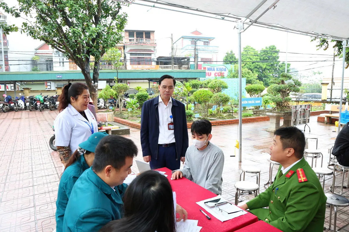 Chủ tịch UBND xã Phú Nghĩa Nguyễn Đình Sỹ đến tận phòng khám động viên thanh niên khám sức khỏe.