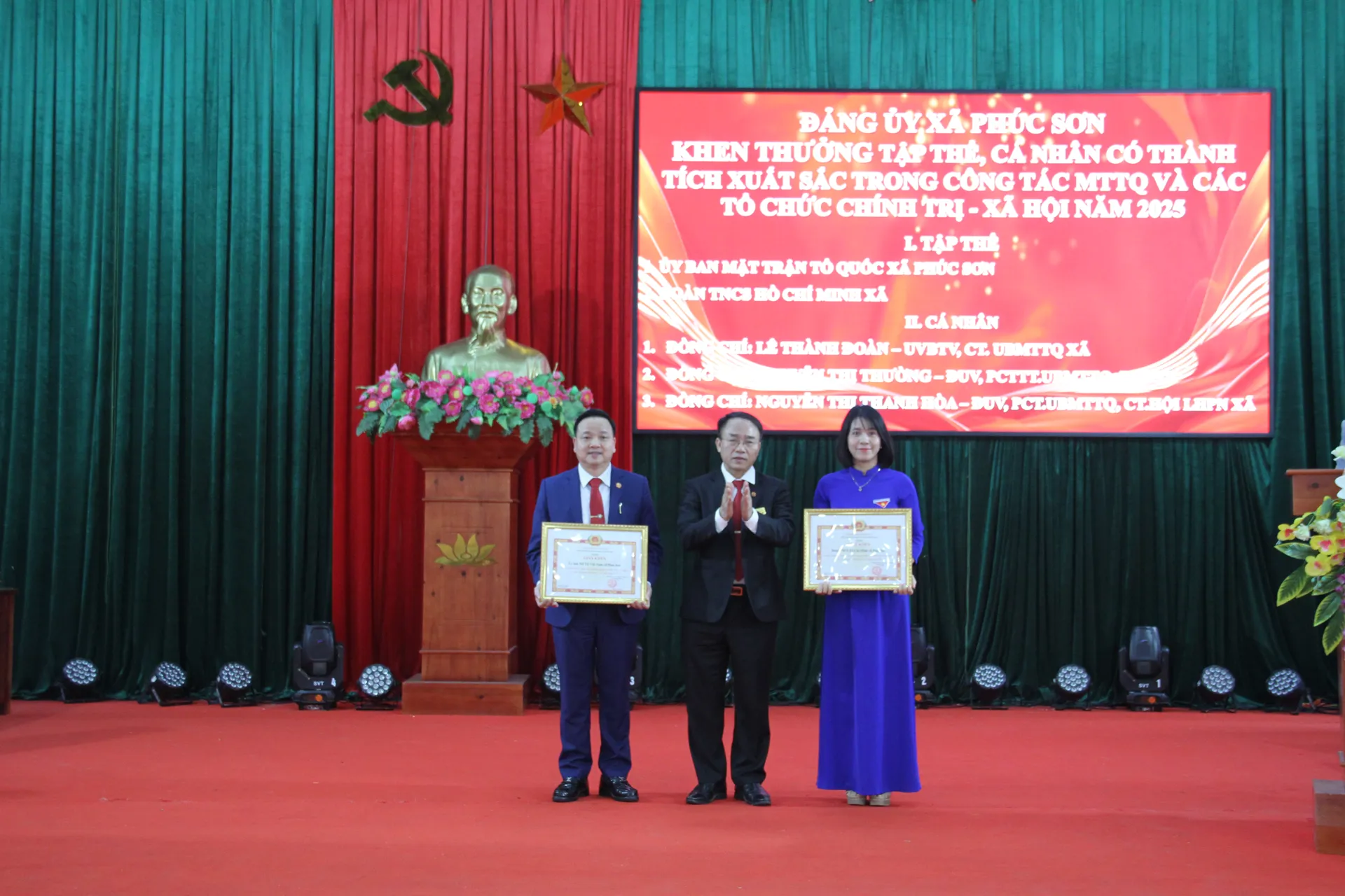 Tại hội nghị, Đảng ủy xã Phúc Sơn đã khen thưởng 2 cho tập thể và 3 cá nhân có thành tích tiêu biểu trong thực hiện công tác Mặt trận và các tổ chức chính trị - xã hội năm 2025.