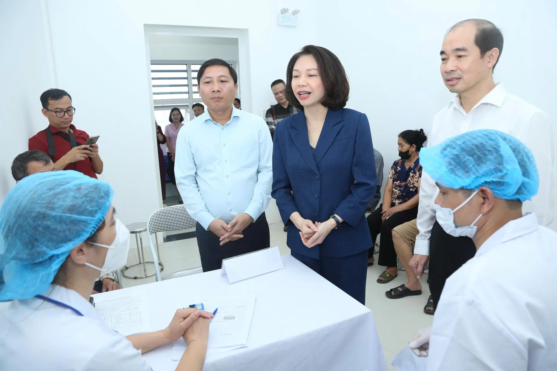 Phó Chủ tịch UBND TP Hà Nội Vũ Thu Hà cũng lãnh đạo xã Quang Minh hỏi thăm sức khỏe người dân đến khám sức khỏe vào sáng 2/10.