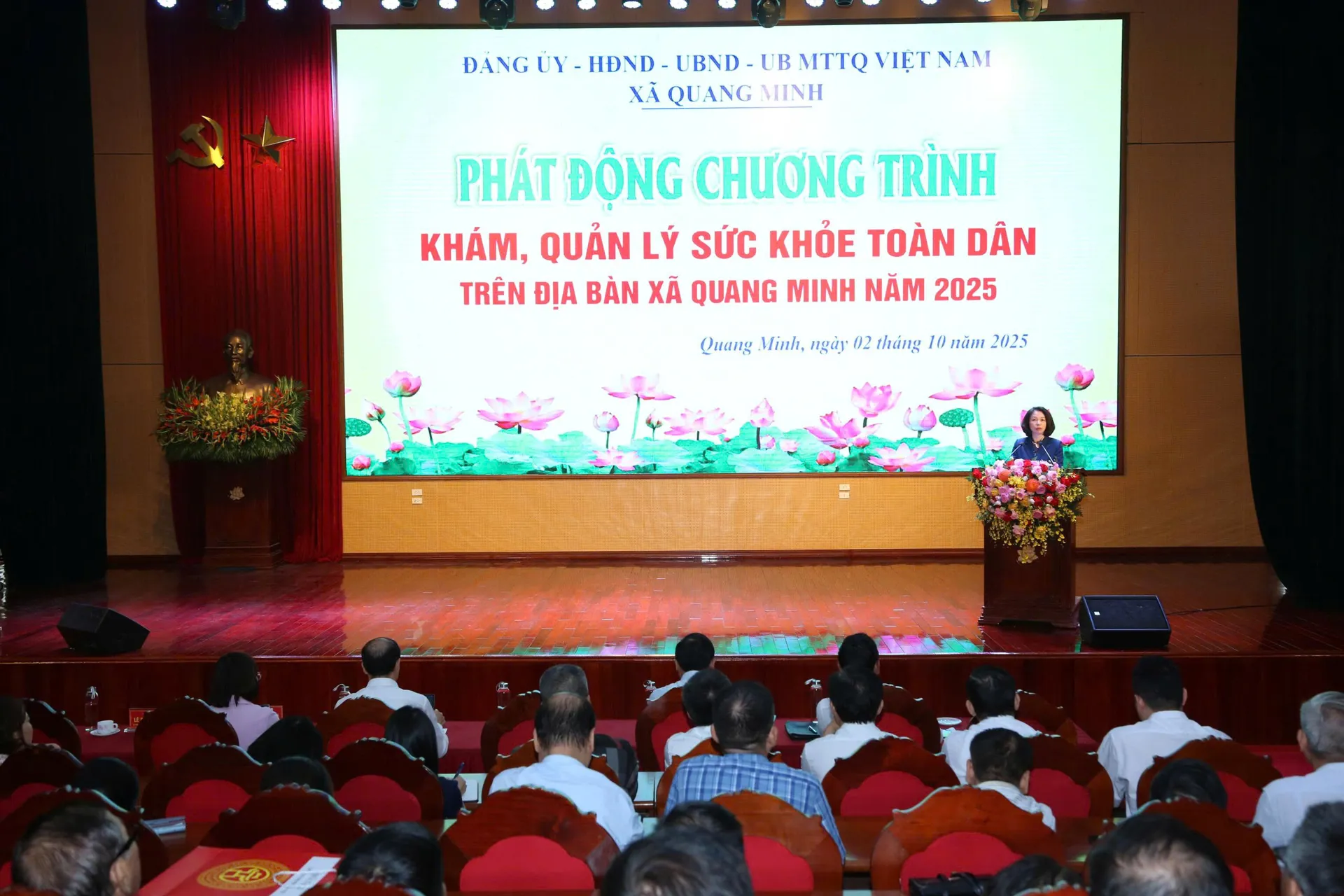 Sáng 2/10, xã Quang Minh (huyện Mê Linh, Hà Nội) đã tổ chức lễ phát động chương trình khám, quản lý sức khỏe toàn dân năm 2025, với sự tham dự của Phó Chủ tịch UBND Thành phố Hà Nội Vũ Thu Hà, lãnh đạo Sở Y tế cùng đông đảo cán bộ, y bác sĩ và người dân địa phương.
