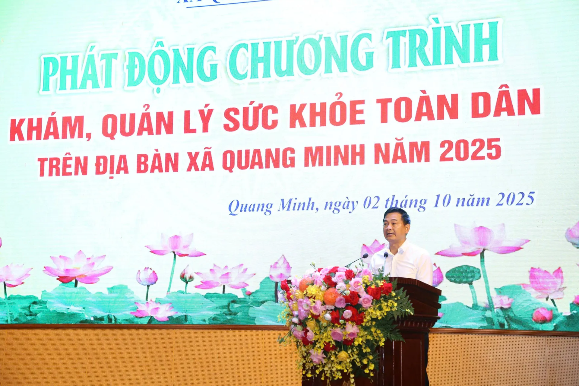 Phát biểu tại buổi lễ, Chủ tịch UBND xã Quang Minh Nguyễn Tiến Dũng nhấn mạnh sức khỏe là vốn quý nhất của con người, là nền tảng để lao động, sáng tạo và cống hiến. Việc triển khai chương trình khám sức khỏe toàn dân tiếp tục khẳng định quan điểm “lấy dân làm gốc”, đồng thời cụ thể hóa tinh thần Nghị quyết số 72-NQ/TƯ của Bộ Chính trị và chỉ đạo của Thành ủy, UBND thành phố Hà Nội về chuyển hướng từ chữa bệnh sang phòng bệnh, tăng cường y tế dự phòng và chăm sóc sức khỏe toàn diện.
