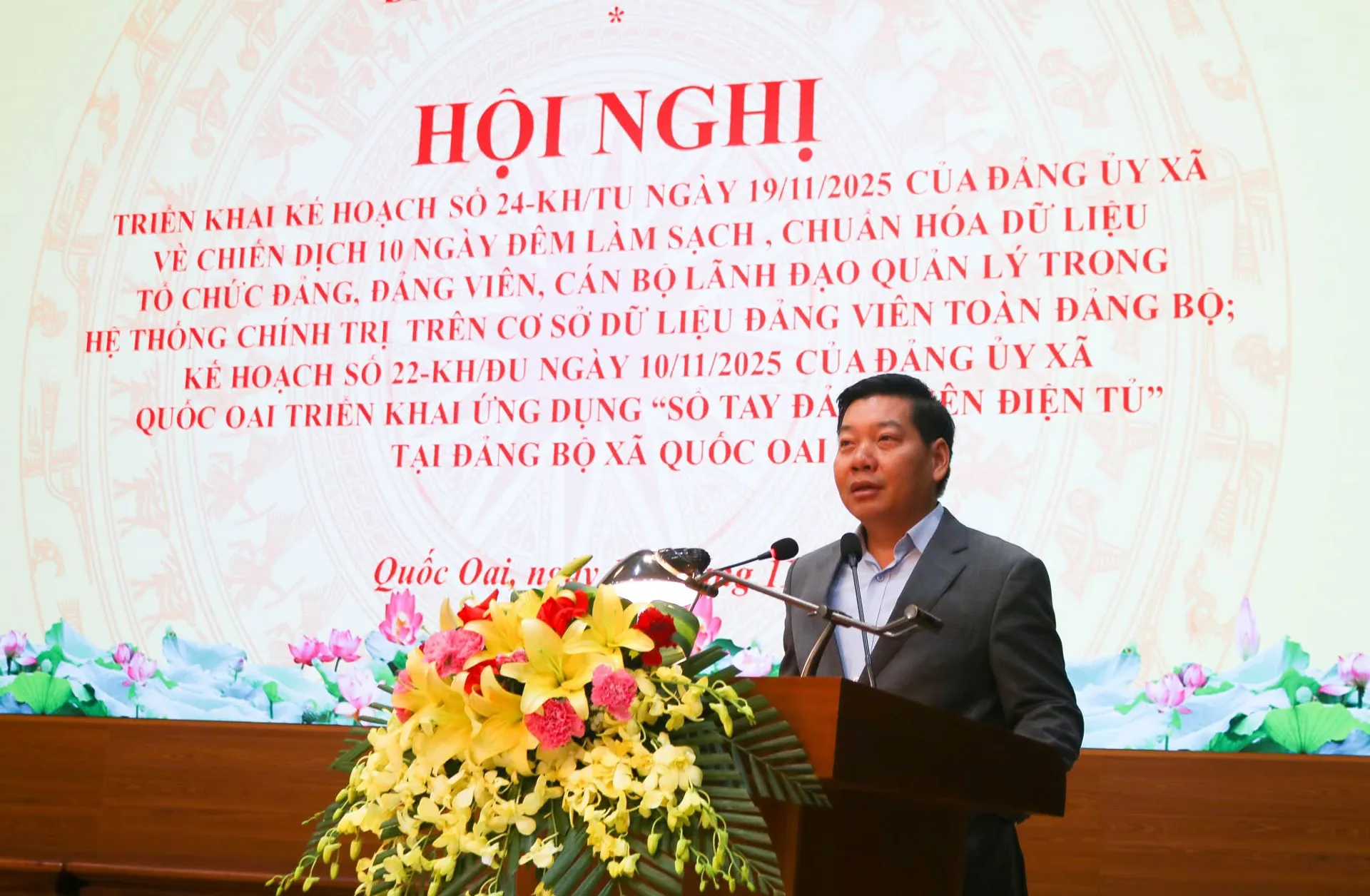 Phát biểu chỉ đạo tại hội nghị, Bí thư Đảng ủy, Chủ tịch HĐND xã Quốc Oai Nguyễn Trường Sơn nhấn mạnh tầm quan trọng của việc chuẩn hóa dữ liệu tổ chức Đảng và đảng viên trong bối cảnh toàn Đảng đang đẩy mạnh ứng dụng công nghệ thông tin và chuyển đổi số. Bí thư Đảng ủy xã Quốc Oai Nguyễn Trường Sơn khẳng định, việc triển khai Chiến dịch 10 ngày đêm làm sạch dữ liệu và ứng dụng “Sổ tay Đảng viên điện tử” không chỉ là nhiệm vụ trước mắt mà còn là giải pháp lâu dài nhằm nâng cao chất lượng công tác quản lý đảng viên, tăng cường kỷ luật, kỷ cương và hiện đại hóa hoạt động của Đảng bộ xã.