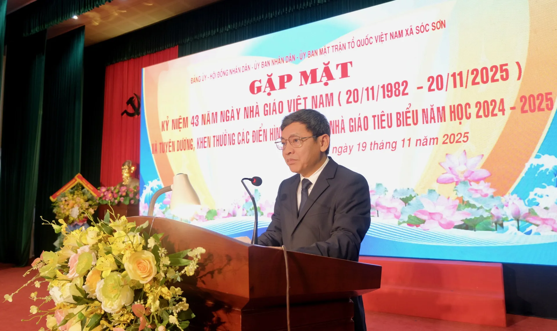 Phát biểu tại lễ kỷ niệm, Chủ tịch UBND xã Sóc Sơn Phạm Quang Ngọc chúc mừng các thành tích mà ngành giáo dục và đào tạo xã nhà đã đạt được, đồng thời gửi tới các thầy giáo, cô giáo, các thế hệ nhà giáo đã và đang công tác trên địa bàn xã Sóc Sơn lời tri ân sâu sắc, lời chúc mừng tốt đẹp.