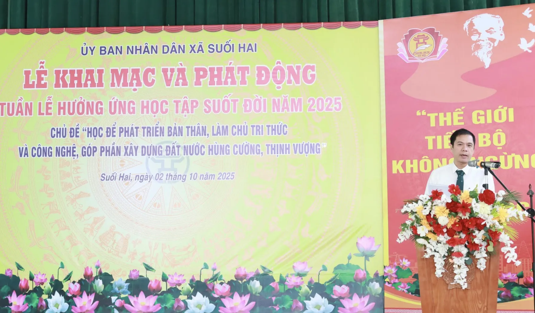 Kinhtedothi - Ngày 2/10, tại Trường Tiểu học Ba Trại A - xã Suối Hai, UBND xã Suối Hai tổ chức Lễ khai mạc Tuần lễ hưởng ứng học tập suốt đời năm 2025 với chủ đề “Học để phát triển bản thân, làm chủ tri thức và công nghệ, góp phần xây dựng đất nước hùng cường, thịnh vượng”.