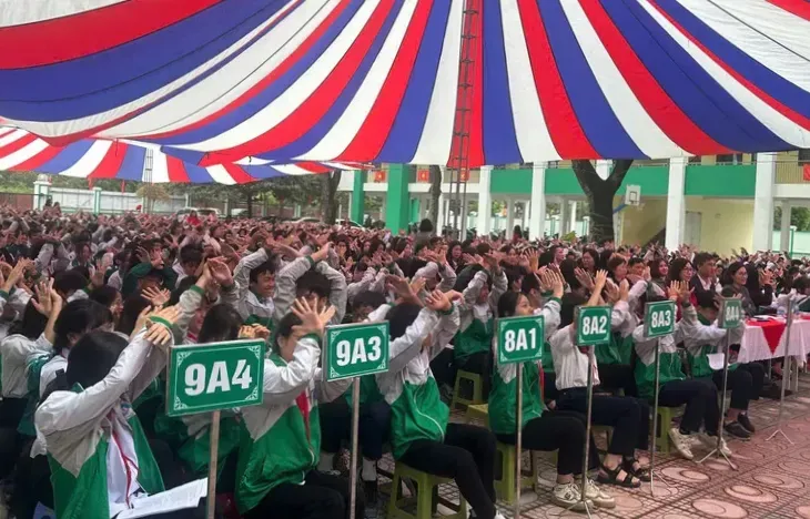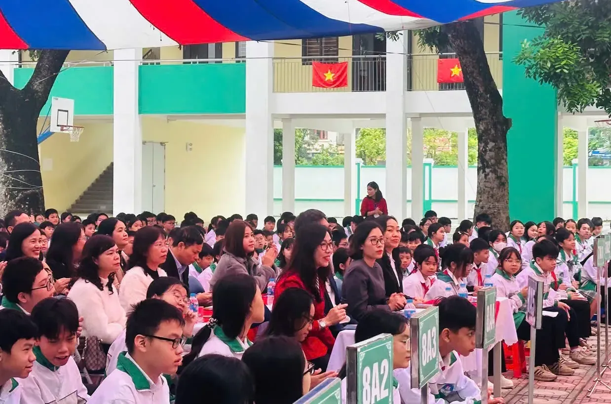 Các đại biểu và học sinh Trường THCS Đặng Xá dự lễ hưởng ứng Ngày Pháp luật Việt Nam năm 2025.