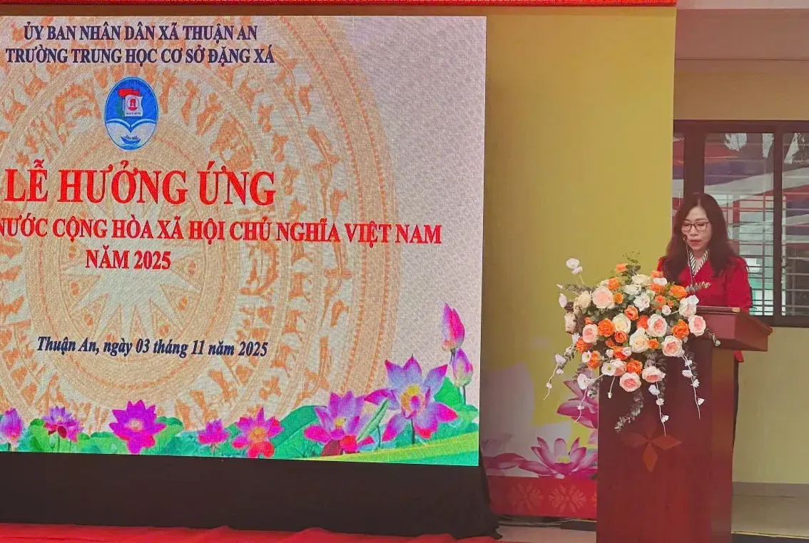 Kinhtedothi-Ngày 03/11, tại Trường THCS Đặng Xá đã diễn ra lễ hưởng ứng Ngày Pháp luật Việt Nam năm 2025. Đây là Nhà trường được UBND xã Thuận An chỉ đạo làm điểm trong khối Giáo dục. Dự buổi lễ có Ủy viên Ban Thường vụ Đảng ủy, Phó chủ tịch UBND xã Thuận An Nguyễn Thanh Hương.