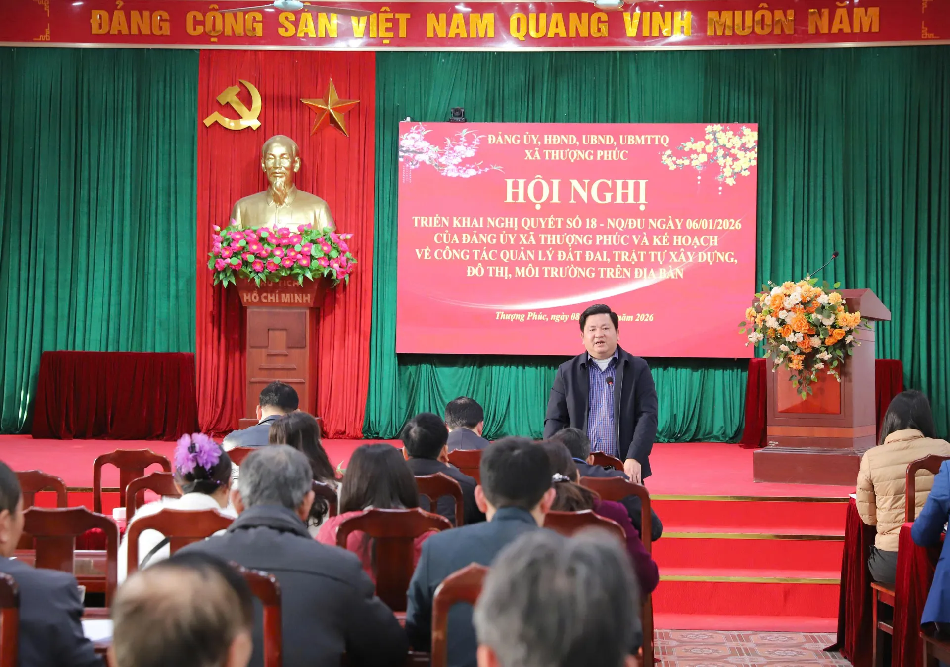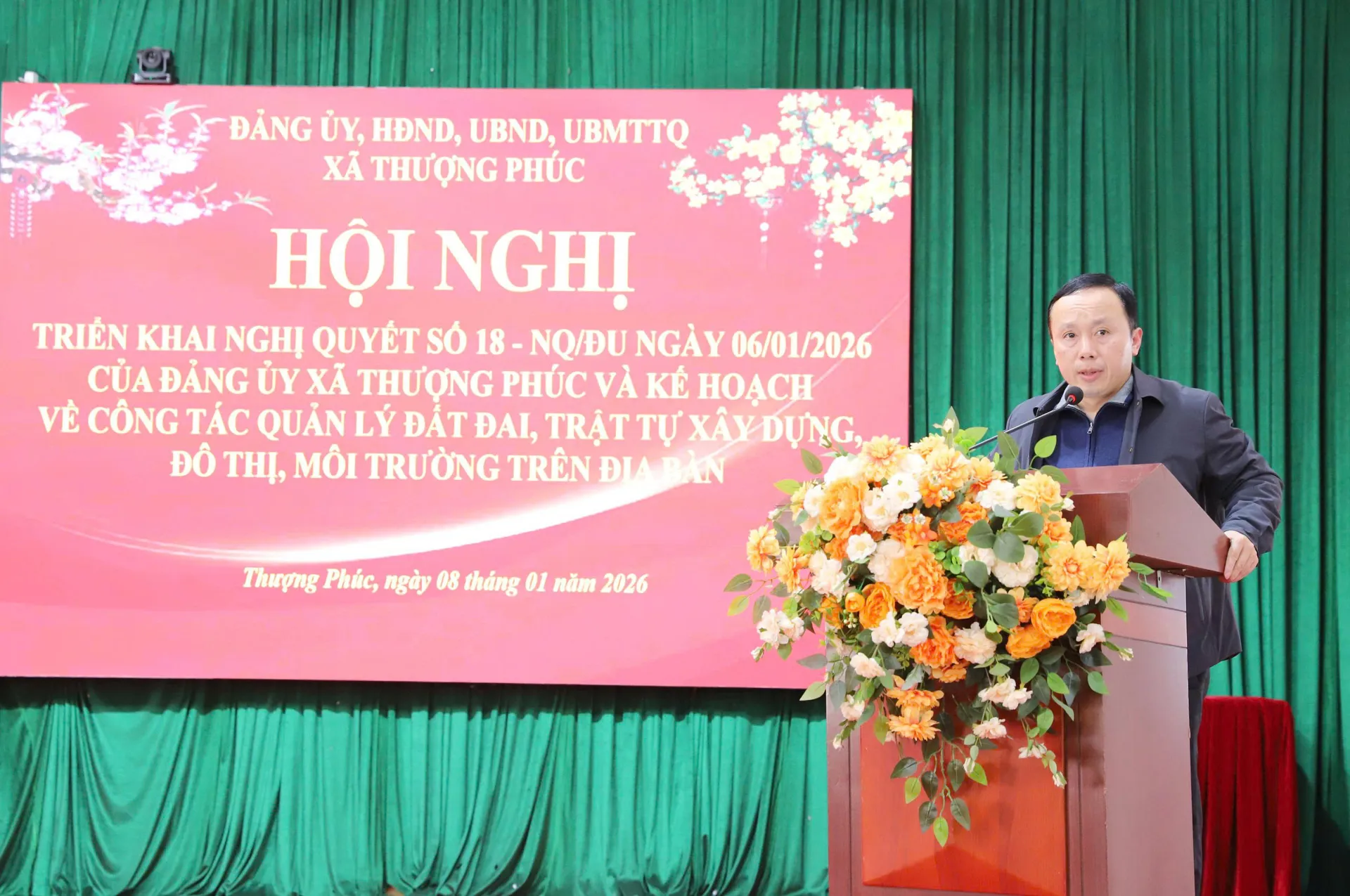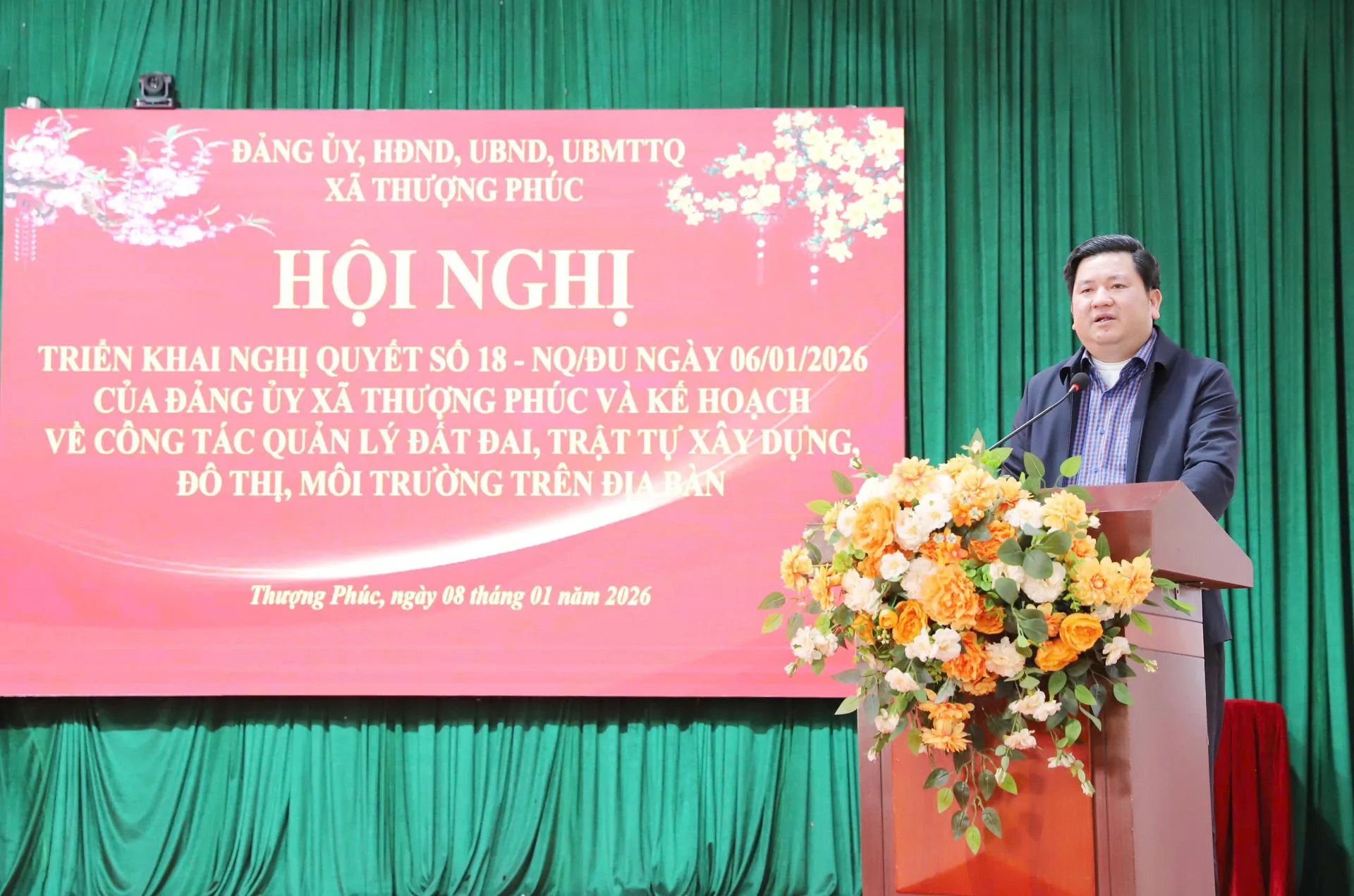Bí thư Đảng ủy, Chủ tịch HĐND xã Thượng Phúc Tạ Hữu Thọ nhấn mạnh, Nghị quyết số 18 - NQ/ĐU ngày 6/1/2026 của Đảng ủy xã Thượng Phúc và kế hoạch về công tác quản lý đất đai, trật tự xây dựng, đô thị, môi trường trên địa bàn xã có ý nghĩ rất lớn, nhằm tạo sự chuyển biến rõ nét về ý thức, trách nhiệm của các ngành, đặc biệt tại các cơ sở thôn, xóm, cụm dân cư trong công tác quản lý đất đai, TTXD, đô thị, môi trường.