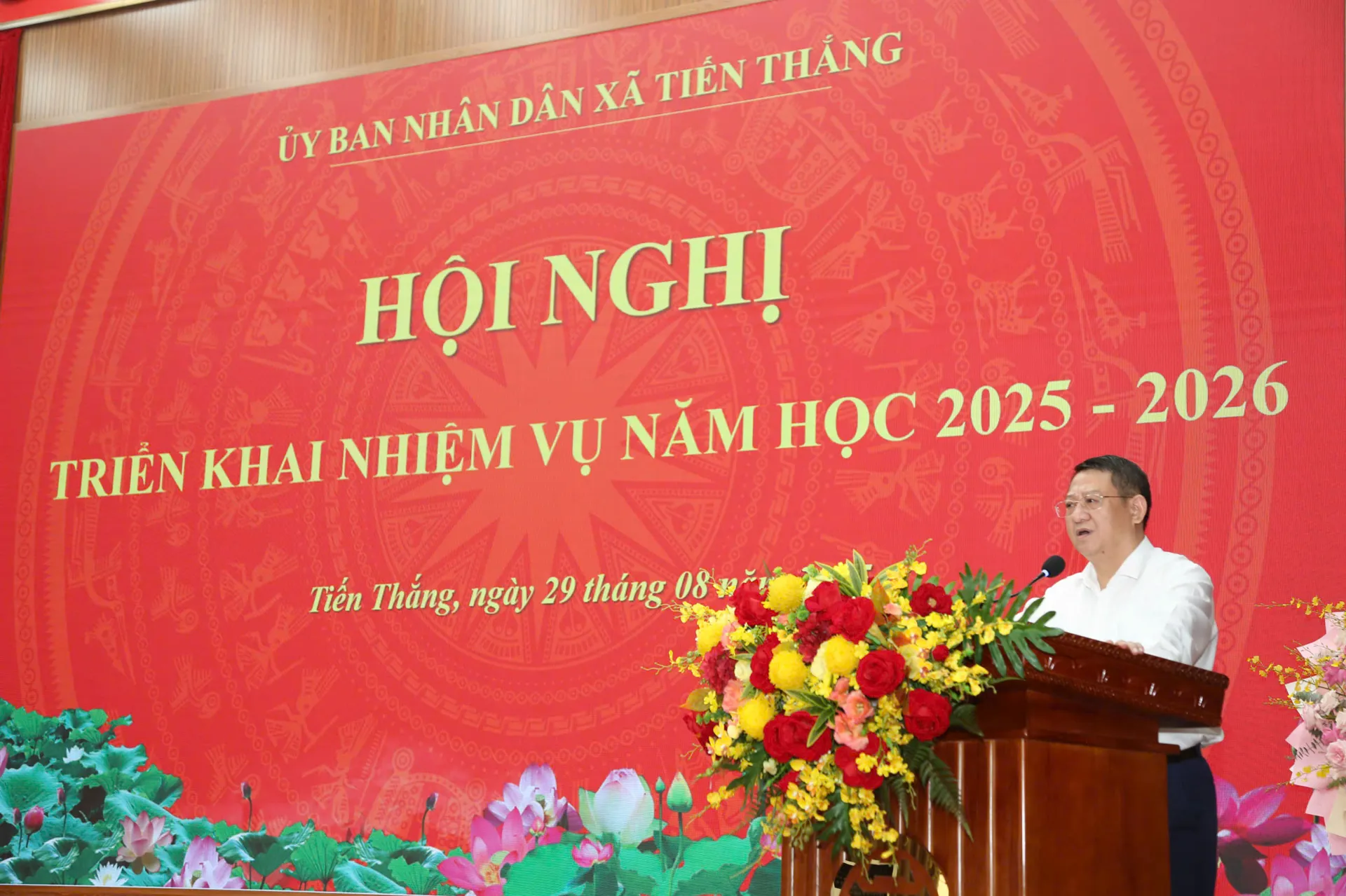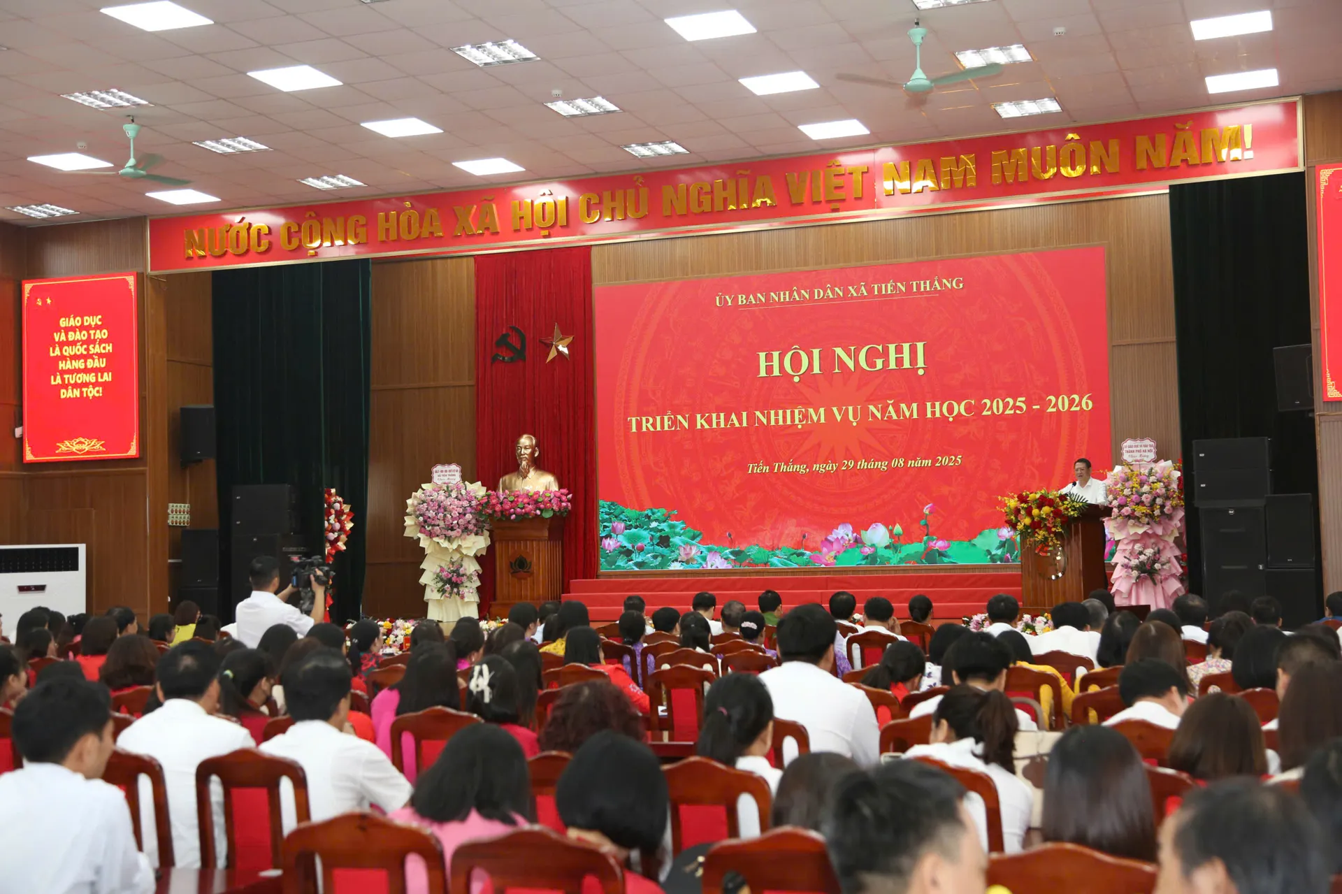 Kinhtedothi - Sáng 29/8, xã Tiến Thắng (Hà Nội) tổ chức Hội nghị triển khai nhiệm vụ năm học 2025-2026. Tham dự hội nghị có Bí thư Đảng ủy, Chủ tịch HĐND xã Hoàng Anh Tuấn; Phó Bí thư, Chủ tịch UBND xã Nguyễn Minh Hải cùng các đồng chí lãnh đạo xã. Hội nghị mời toàn bộ lãnh đạo các nhà trường, giáo viên chủ nhiệm, Bí thư Chi bộ, trưởng thôn trên địa bàn để quán triệt mục tiêu giáo dục, đào tạo thế hệ trẻ của xã Tiến Thắng.