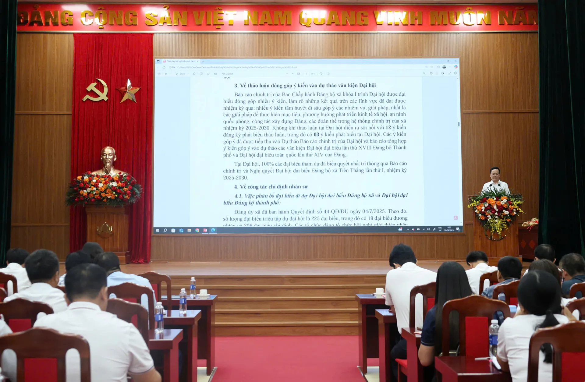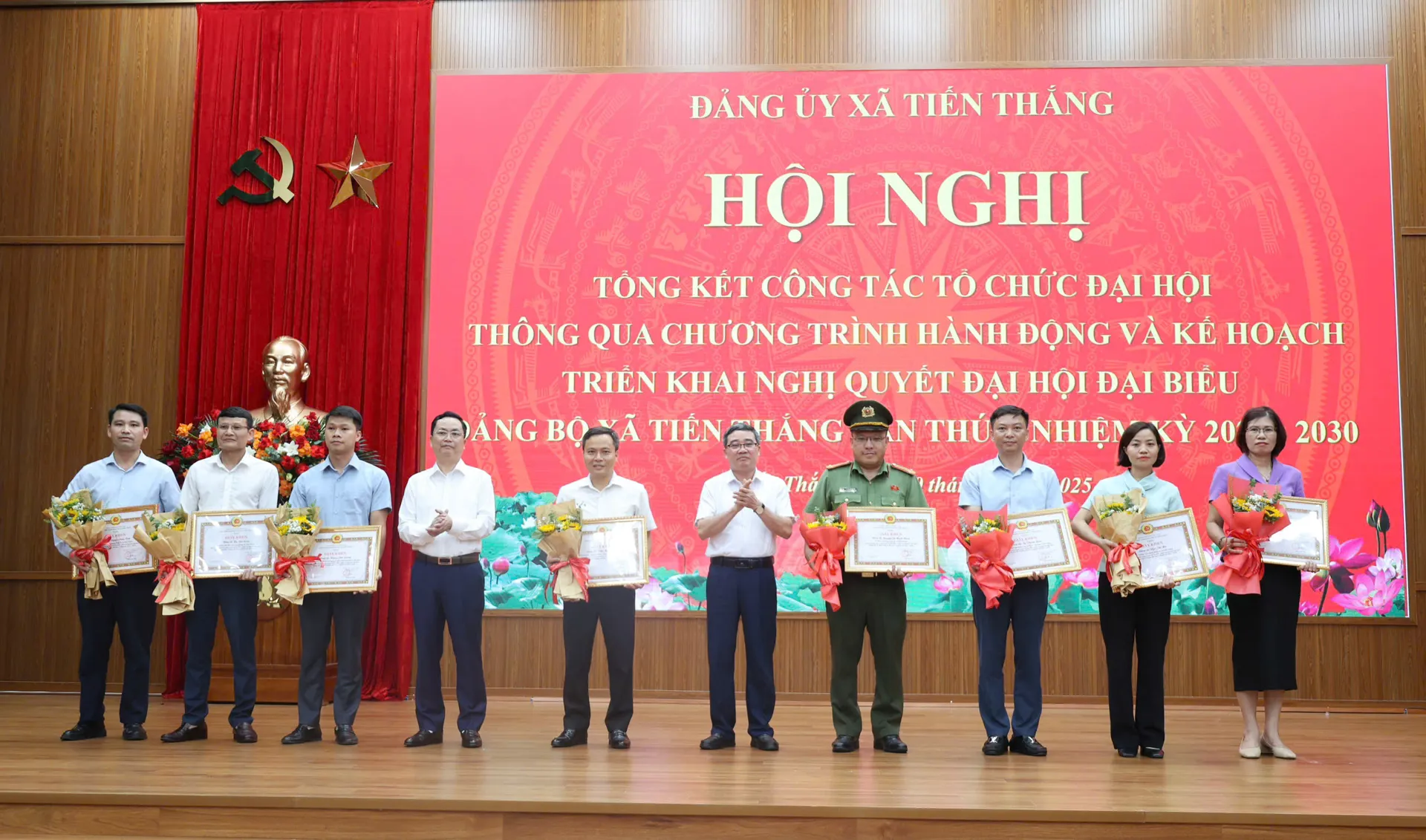 Đại hội đại biểu Đảng bộ xã Tiến Thắng lần thứ I diễn ra trong 2 ngày (4 và 5/8), với tinh thần “Đoàn kết - dân chủ - kỷ cương - đột phá - phát triển”. Các đại biểu đã tập trung trí tuệ, trách nhiệm cao, thảo luận, đóng góp nhiều ý kiến tâm huyết vào Báo cáo Chính trị của Đảng bộ, đồng thời biểu quyết thông qua Nghị quyết Đại hội với sự thống nhất tuyệt đối. Đại hội cũng đã chỉ định Ban Chấp hành khóa I gồm 21 đồng chí, Ban Thường vụ gồm 10 đồng chí, bầu Bí thư, Phó Bí thư và Ủy ban Kiểm tra Đảng ủy xã nhiệm kỳ 2025 - 2030.