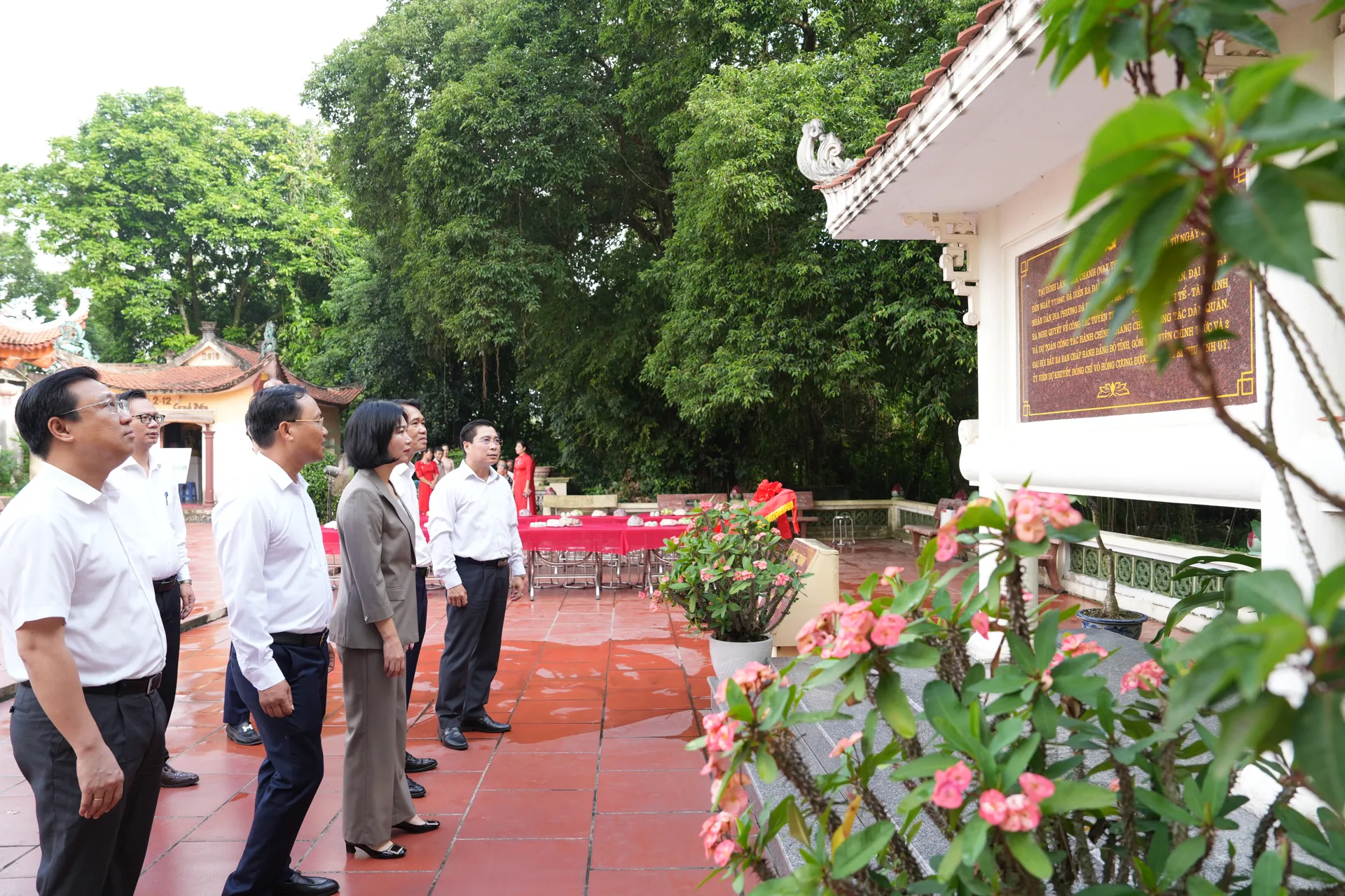 Uỷ viên Ban Thường vụ Thành uỷ, Phó Chủ tịch Thường trực HĐND TP Hà Nội Phùng Thị Hồng Hà và các đại biểu tham quan đình Hoà Chanh. Ảnh: Lại Tấn