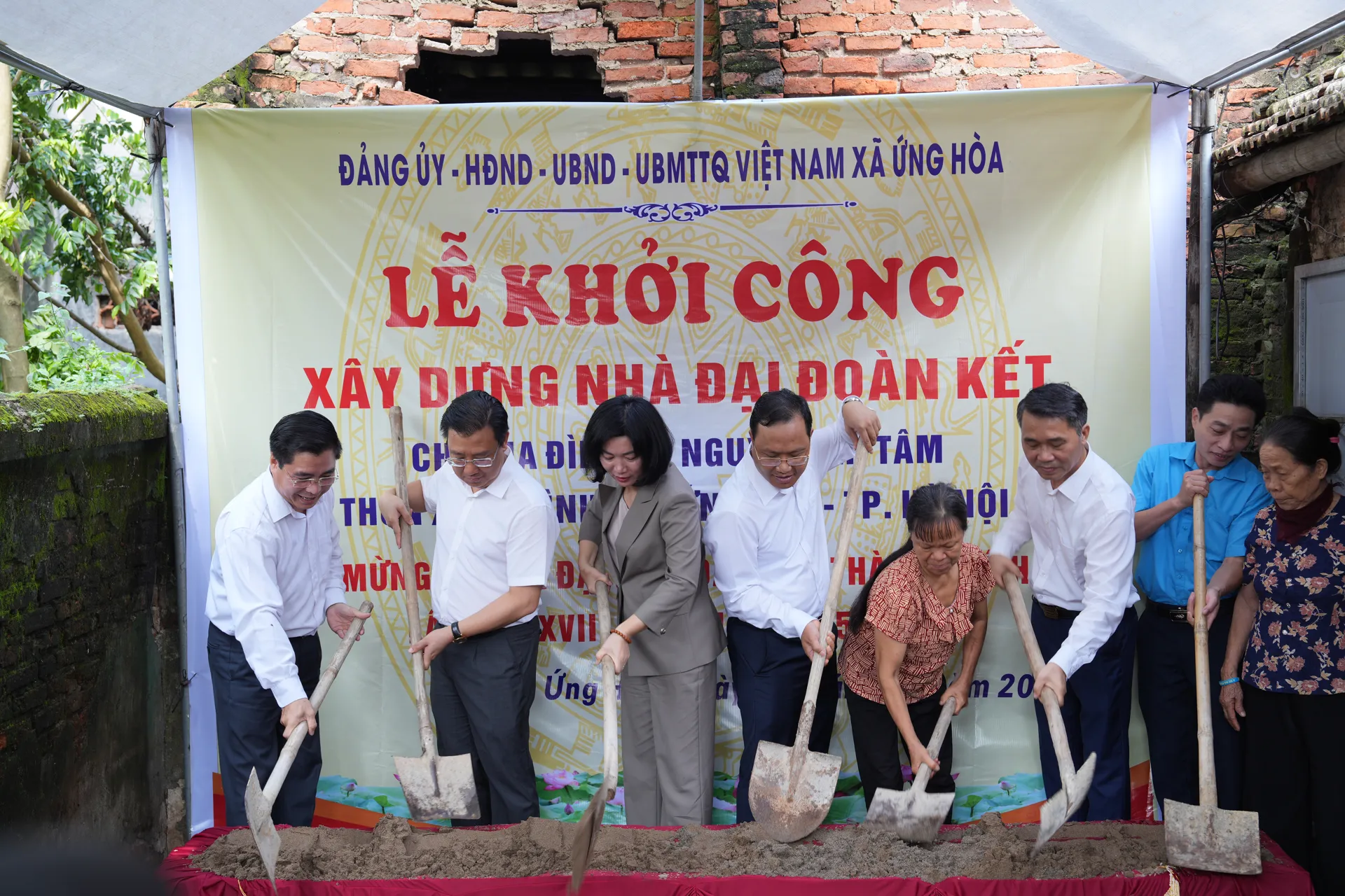 Lãnh đạo TP Hà Nội và xã Ứng Hoà thực hiện nghi Lễ khởi công xây dựng nhà Đại đoàn kết. Ảnh: Lại Tấn
