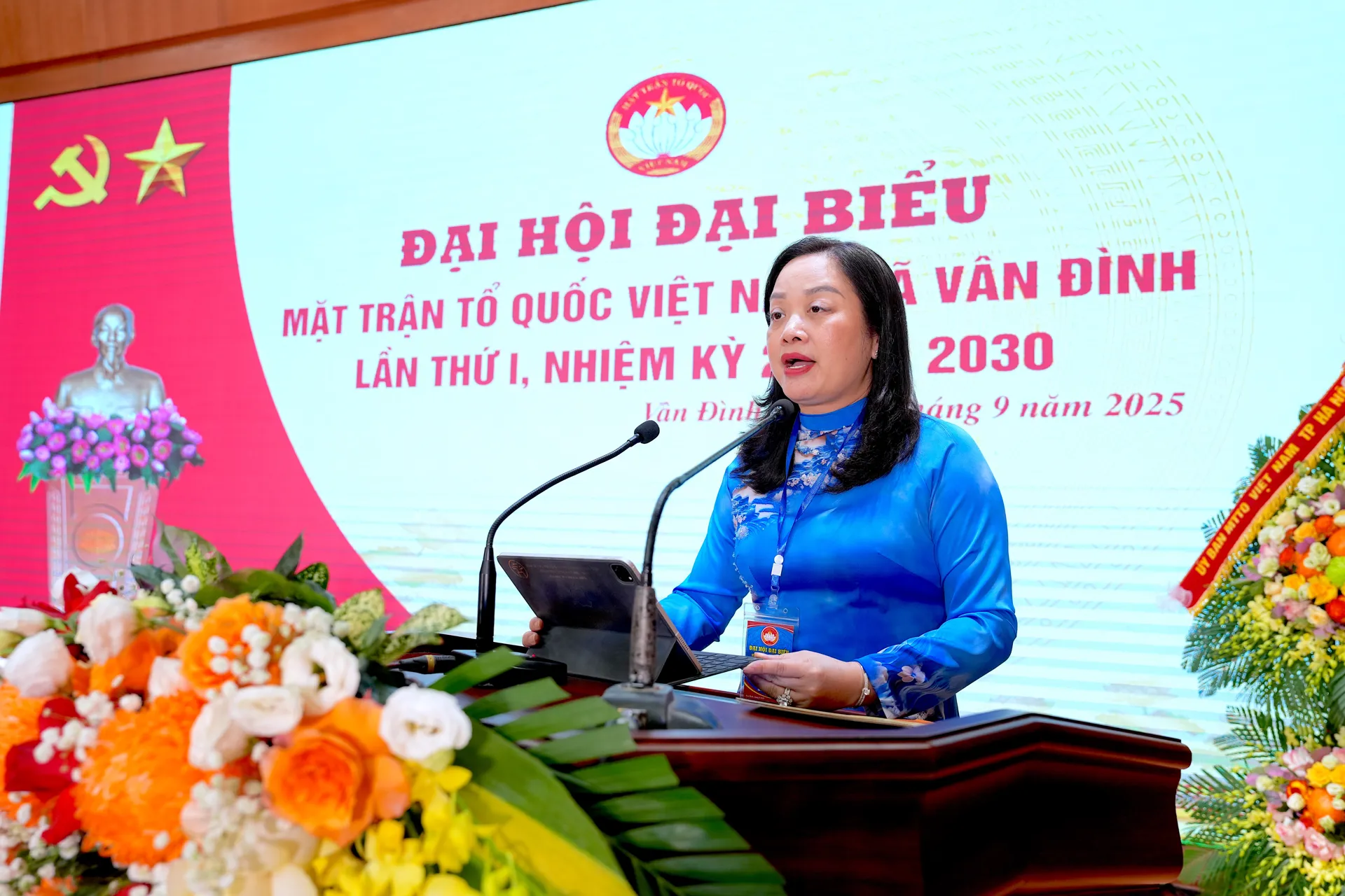 Bí thư Đảng uỷ, Chủ tịch HĐND xã Vân Đình Bùi Thị Thu Hiền tặng hoa chúc mừng Đại hội. Ảnh: Lại Tấn